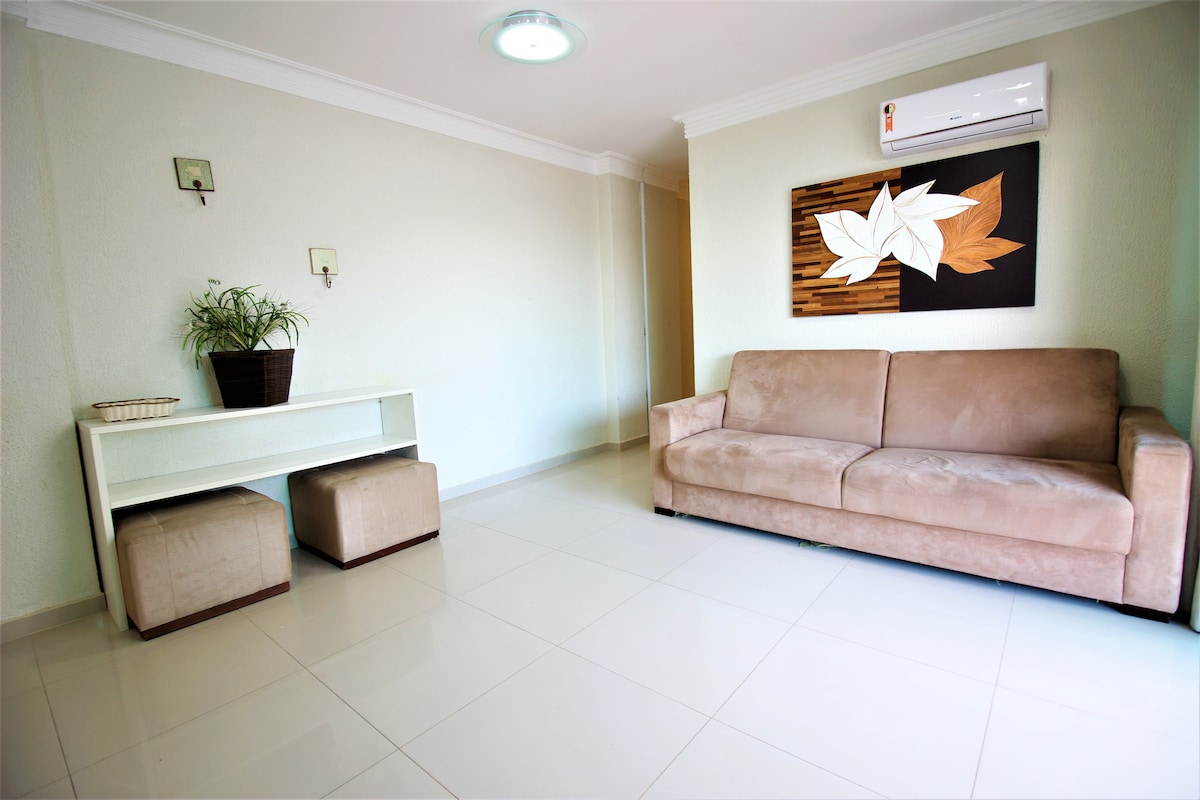 O imóvel possui: -1 dormitório de cama queen com Tv e ar-condicionado. -Banheiro social. -Sala de estar com confortável sofá cama,Tv e ar-condicionado. -Cozinha completa geladeira,micro ondas e utensílios básicos. -Balcão com 3 lugares -Sacada com churrasqueira e mesa para 4 pessoas. -Área de serviço com maquina. -1 vaga de garagem. -Roupa de cama e banho, podem ser contratado separadamente consulte-nos