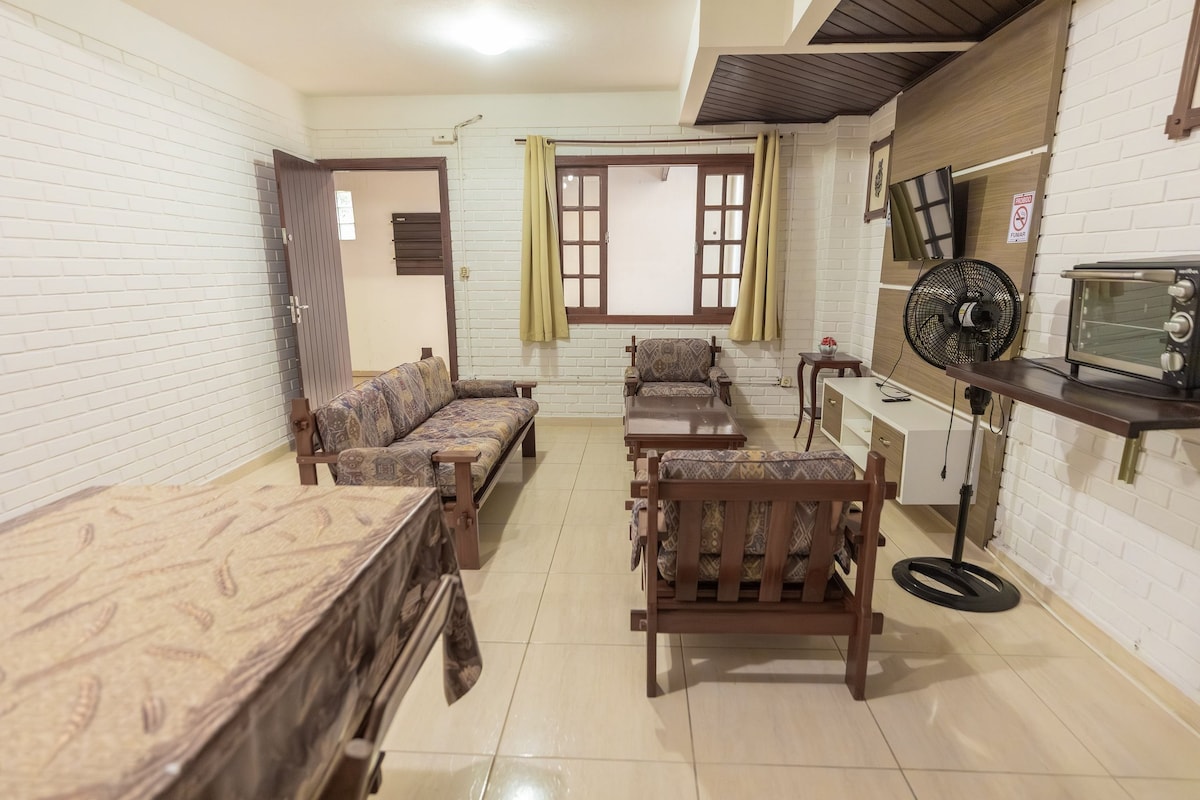 Dzīvoklis ar 2 guļamistabām ir 1 "suite" numurs ar balkonu, pilnu virtuvi, viesistabu, privātu balkonu ar galdu 4 sēdvietām, grilu un 2 šūpuļtīkliem atpūtai, TV, Wi-Fi, sociālo vannasistabu, apkalpošanas zonu un segtu garāžu. Lieliska atrašanās vieta 100 metru attālumā no Cachoeira do Bom.com.br, netālu no lielveikaliem, restorāniem, aptiekām, maiznīcām... Pilnībā mēbelēts dzīvoklis, kas ir gatavs jūsu un jūsu ģimenes atpūtai, lai baudītu visu komfortu pludmales tuvumā.