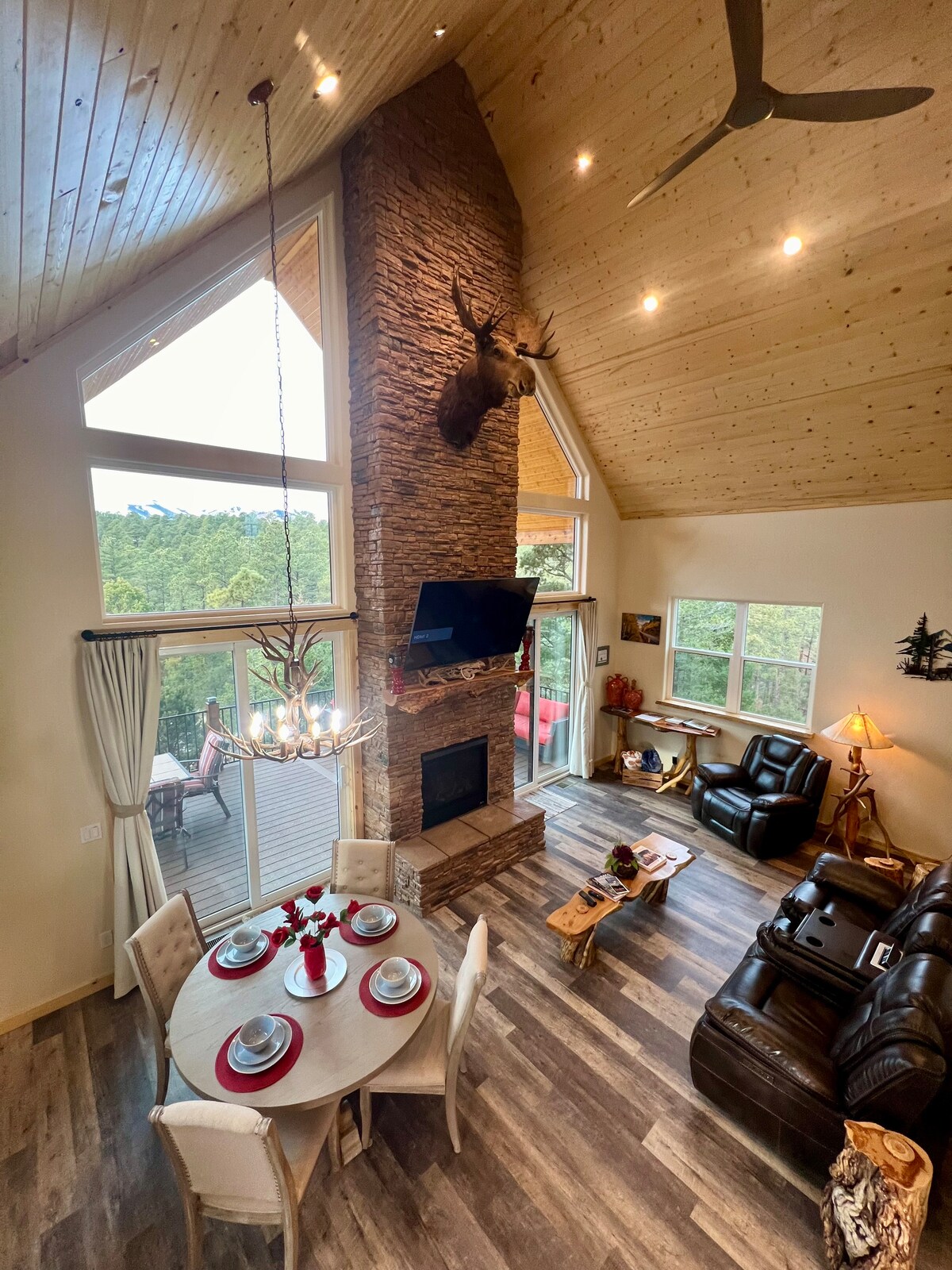 No skaistā 2 stāvu 2 gultu 2 vannu namiņa paveras BRĪNIŠĶĪGS netraucēts skats uz Sierra Blanca kalnu, un tas atrodas augstu starp priežu kultūrām pievilcīgā apkaimē. Divas karalienes guļamistabas, pilna virtuve, skaists sarkans efektīvs kamīns, apkure un dzesēšana, lieli logi no den zonas, kas vērsti uz kalniem. Wi-Fi, televizors ar DVD atskaņotāju un Roku augšstāvā un mazāks Roku televizors apakšstāvā. **Kopš 2024. gada jūnija ugunsgrēka namiņš ir neskarts - lūdzu, skatiet atjaunināto pievienoto attēlu ar nosaukumu "Jauns ainavas skats pēc 2024. gada jūnija"**