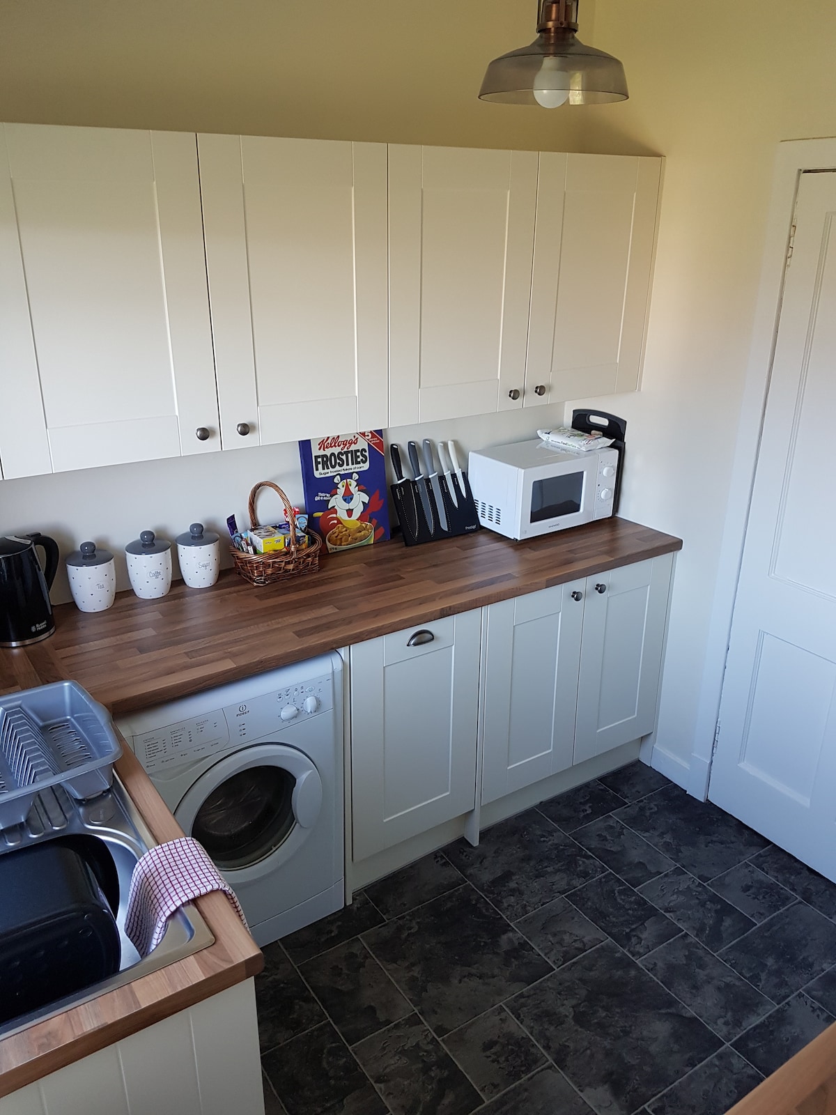 Šim zemākajam dzīvoklim ir apvienota virtuve un atpūtas telpa. Virtuvē ir mikroviļņu krāsns, tosteris un tējkanna. Pieejama veļas mašīna un veļas žāvētājs. Tie atrodas koka šķūnī, kas atrodas tuvāk dzīvokļiem. Tiek nodrošināta TV. Guļamistabām tiek nodrošinātas papildu segas. Ir atvilktne un skapis vietas. Dzīvokli apsilda uzglabāšanas sildītāji. Nodrošināta visa gultas veļa un dvieļi. Ir nodrošināta āra sēdvieta un bezceļa stāvvieta. Ir pieejams Wi-Fi.