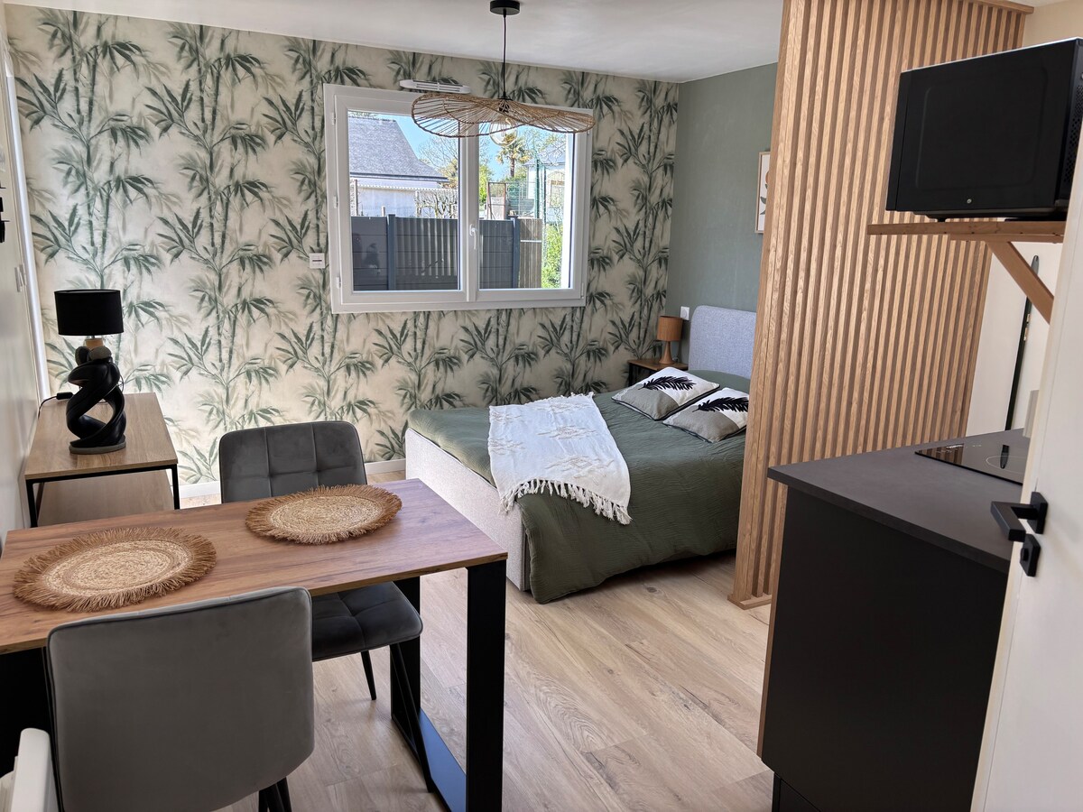 Studija, kas atrodas mūsu lielās lauku mājas aizmugurē. Blakus manai studijai. Dzīvojamā istaba 26 m2 un vannasistaba 10 m2. Ērti un klusi nelielā ciematā 4 km attālumā no Kolpo ciema un 4 km attālumā no Saint Jean Brevelay. 160x200 gulta, neliela dzīvojamā istaba ar fiksētu dīvānu (nav kabriolets). Grīda ir jūras steigā, tāpēc to nevar mazgāt. Aprīkota un ērta virtuvīte. Liela vannasistaba ar dušu un tualeti. Iespēja ieturēt maltītes ārā. pieejama gultasveļa un dvieļi