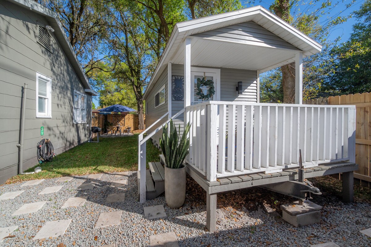 Modern, minimalist, tiny home with artistic decor. This property has mature oaks, many windows and natural lighting. There is outdoor dining, hot tub, lounge chairs, fire pit, fishing pond, and an extensive garden for nature lovers. Shopping (10 mins), USF (15 min), Busch Gardens/Adventure Island (20 min), Clearwater Beach (45 min), Raymond James Stadium (30 min), TPA (35 min), downtown Tampa (30 min), Ybor (30 min), Disney (1.5 hr). Please give us a call if you have questions.