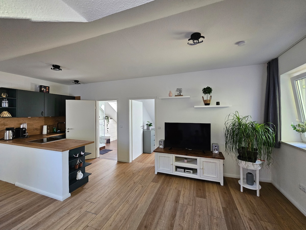 Moderns dzīvoklis netālu no dabas lofta stilā. Mansarda dzīvoklim ir neliels balkons ar skatu uz laukiem . Jūsu rīcībā ir labs interneta savienojums, izmantojot optiskās šķiedras savienojumu. Arī sienas kaste.