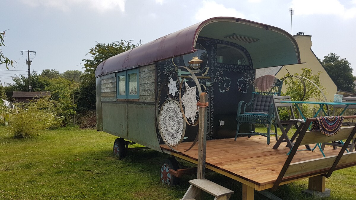 Ērta dzīvojamā piekabe, kas atrodas meža malā. Zeme (2500 m2) ir koplietojama ar manām jurtām (galveno māju) un 3 citiem īres mājokļiem. Ekoloģiskā pārvaldība (permakultūra), atsevišķa saules elektroenerģijas vieta, sausā tualete. Pēc rezervācijas: brokastis, maltītes, masāžas (skatiet sadaļu "Saziņa ar viesiem"). Daudzas pārgājienu takas mežā. Atrodas 10 minūšu attālumā no Dinanas, 20 minūšu attālumā no jūras un Rance, 45 minūšu attālumā no Mont St Michel, Rennes vai Brocéliande.