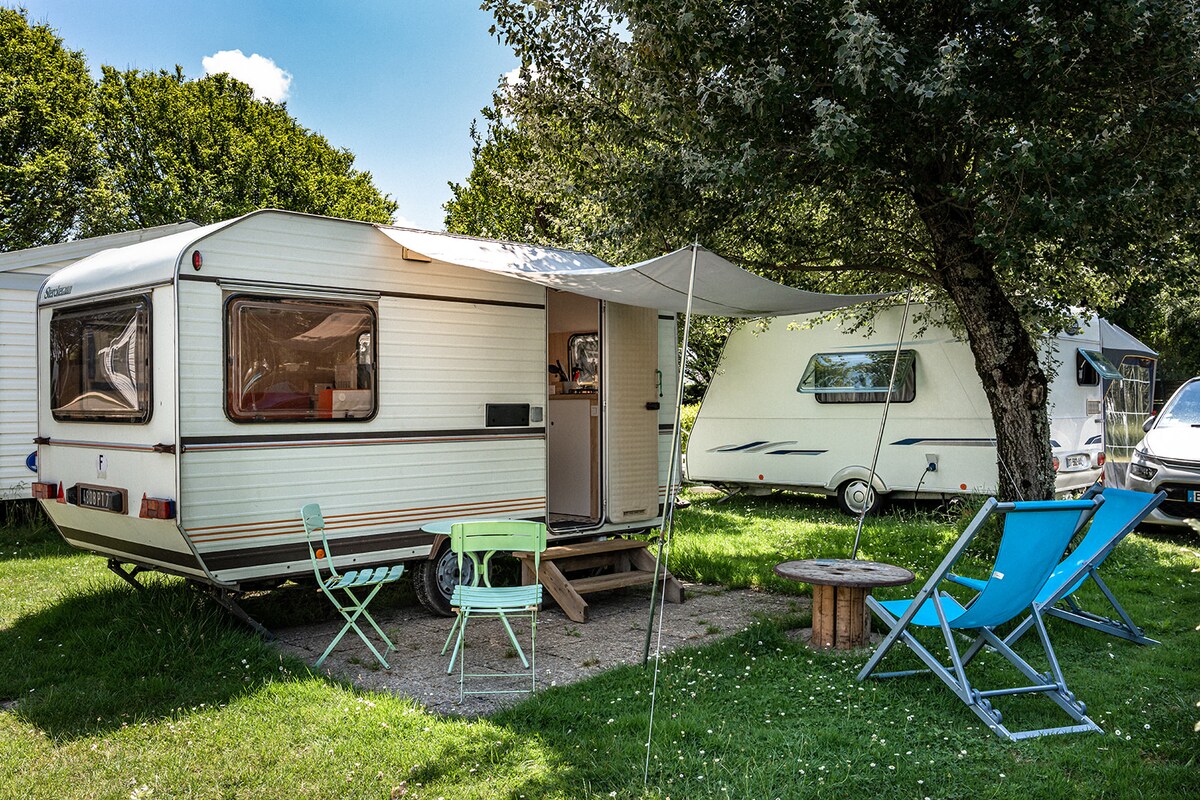 Garantēta ainavas maiņa mūsu 70. gadu treilerī! Mēs piedāvājam jums mūsu mazo dārgakmeni, kas var uzņemt ne vairāk kā 3 cilvēkus mūsu mežainajā zemē, laukos starp Bretaņu un Normandiju. Neliels, neparasts kokons uz mūsu zemes, bet neatkarīgs un bez vis-à-vis ar mūsu dzīvojamo māju. Jūsu rīcībā ir trīs nelielas gultas (perioda izmēri: 1 matracis 1 personai 70 x 190 un 1 jauns matracis (šaurs) 2 cilvēki 120 x 175.