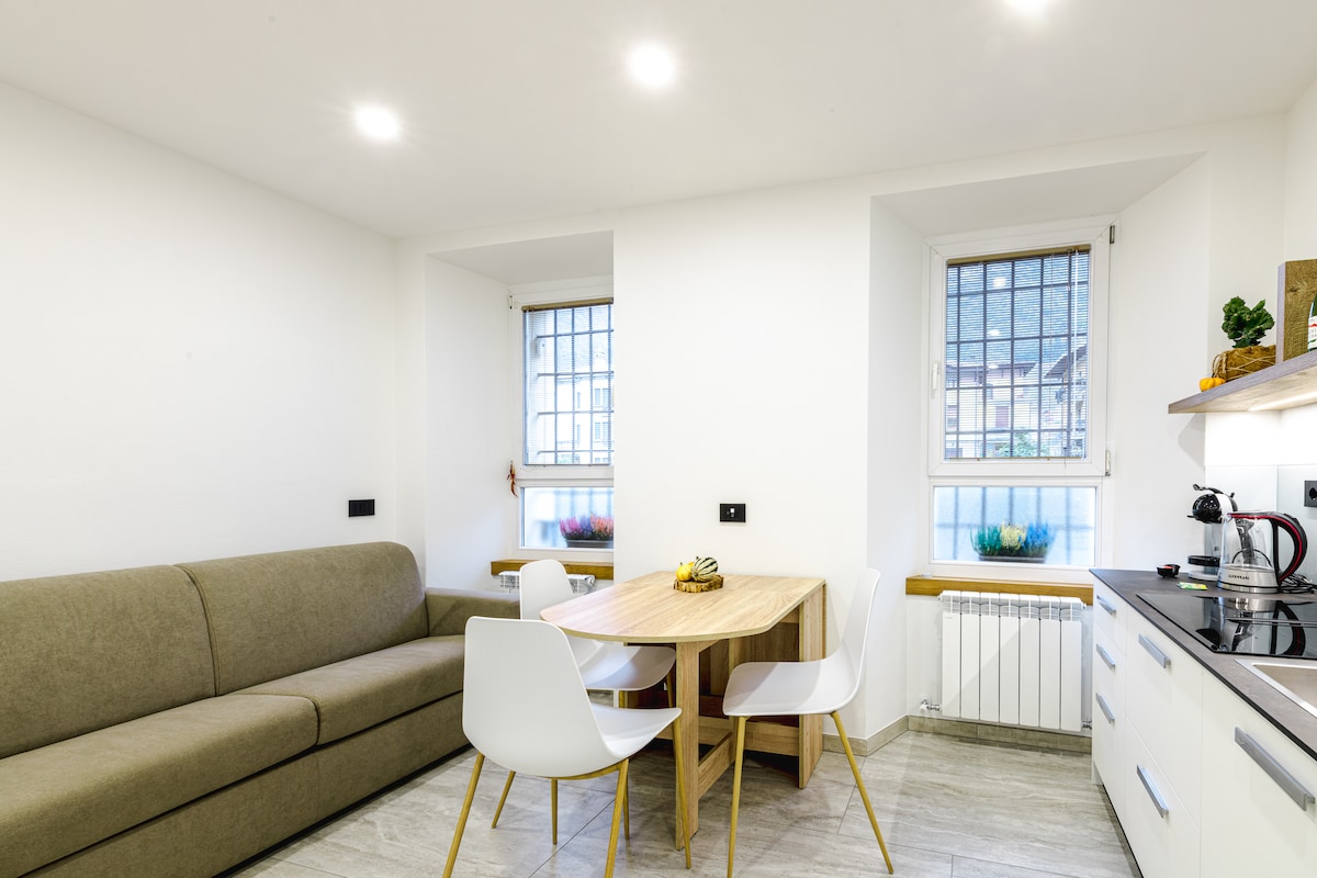 Jaunatjaunots dzīvoklis ar visu nepieciešamo virtuvei, vannas istabu un istabām, lielu terasi ar skaistu skatu uz apkārtējiem kalniem un Adamello parku, tikai metru attālumā no galvenā ceļa, ko ieskauj bāri, picērijas, skaistumkopšanas un labsajūtas centri un veikali, autobusa pietura 4 minūšu gājiena attālumā, bezmaksas autostāvvieta visapkārt laukumam, Lombardijas un Trentīno Alto Adidžes galveno Alpu pāreju vidū, ekoloģija-dabas sporta-kultūra-relakss-