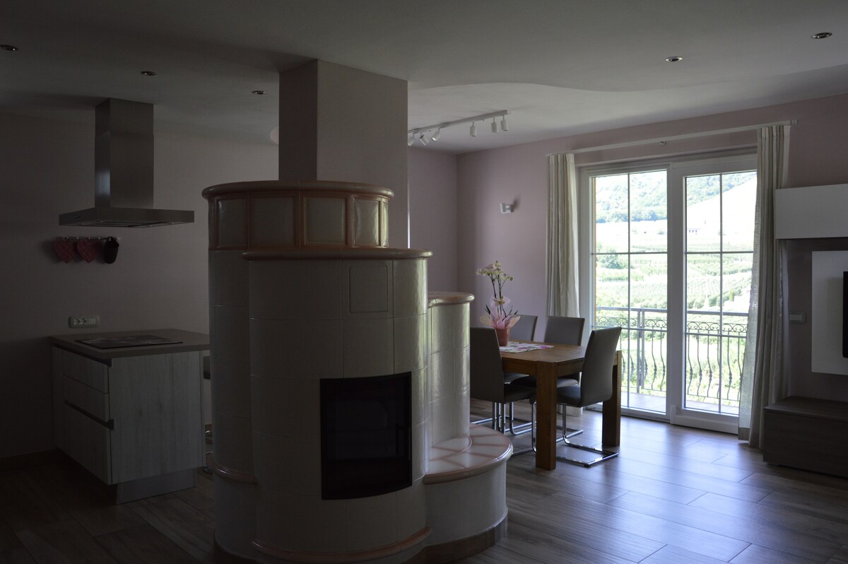 Elegants 2 istabu dzīvoklis ar sēdvietām dārzā un skatu uz kalniem