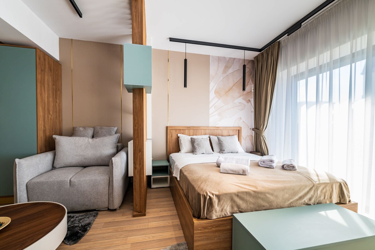 Laipni lūdzam mūsu centrā esošajā studijā tikai 12 minūšu attālumā no Tautas nama un 10 minūšu attālumā no Unirii laukuma, kurai ir sava autostāvvieta! Atrašanās vieta ir ideāli piemērota darījumu braucienam / pārim / nedēļas nogales atpūtai pilsētā un piedāvā plašu un ērtu vietu. Dzīvojamā istaba ir plaša, aprīkota ar dīvānu un ēdamzonu, kā arī ātru Wi-Fi. Virtuvē ir viss, ko vēlaties. Palagus un dvieļus tīra uzņēmums, kas specializējies šajā jomā.