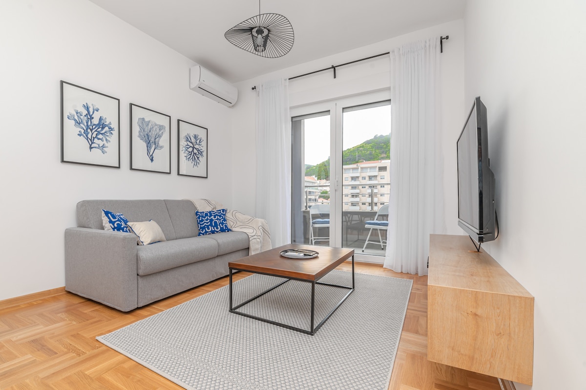 Ērti, mājīgi dzīvokļi ar modernu renovāciju un elegantu skatu uz kalniem un pilsētu ar prieku uzņem savus viesus! Jūsu ērtai uzturēšanai ir 6 gultas: 2 gultas un dīvāngulta. Virtuvē ir visa nepieciešamā tehnika: kafijas automāts kafijas pupiņām, cepeškrāsns, mikroviļņu krāsns, tējkanna, ātrgaitas internets, gaisa kondicionētāji un rullo žalūzijas katrā istabā. 2 terases ar skatu uz kalniem un Budvas pilsētu, 2 Smart TV un Wi-Fi, 2 pilnas vannasistabas un veļasmašīna.
