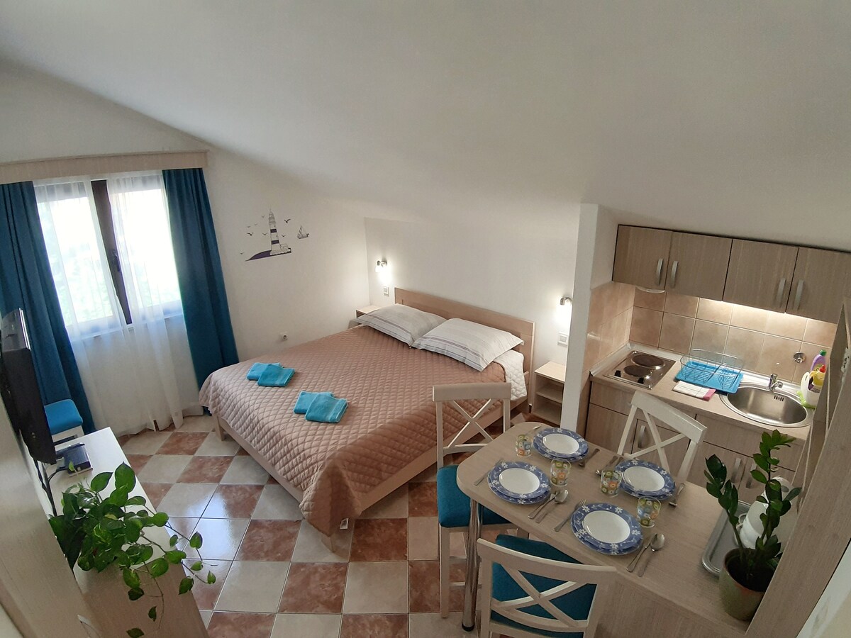 Skaists dzīvoklis ar skatu uz jūru tikai 5 minūšu attālumā no Budvas vecpilsētas. Vannasistaba, virtuve, kabeļtelevīzija, WiFi. Ideāli piemērots atvaļinājumam. Mājīgs dzīvoklis, tuvu vecpilsētai. Labākajā vietā Budvā. Mājīgi dzīvokļi Budvas centrā, 5 minūšu attālumā no vecpilsētas, skats uz jūru, guļamistaba, duša, virtuve, TV, internets