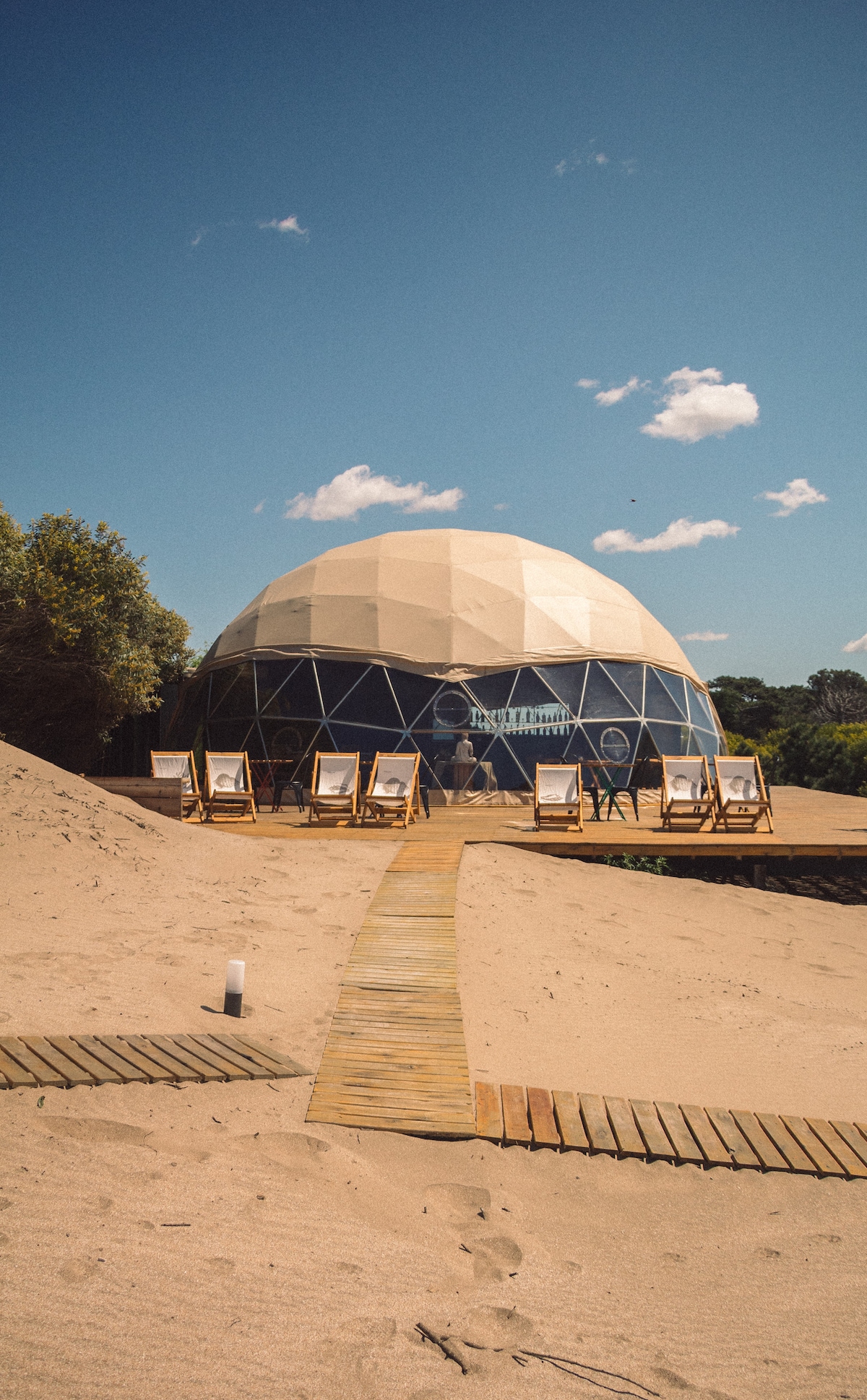 Domo Gaia - Acceso a piscinas, balneario y estacionamiento incluidos. Es un refugio premium con baño en suite y mirador de estrellas frente al mar. Calma entre médanos y vegetación nativa. Ideal para reconectar con la naturaleza y descansar en un entorno único, cálido y silencioso. Su diseño geodésico y artesanal combina confort, madera y paisaje costero. A pasos de la playa, perfecto para parejas o quienes buscan paz.