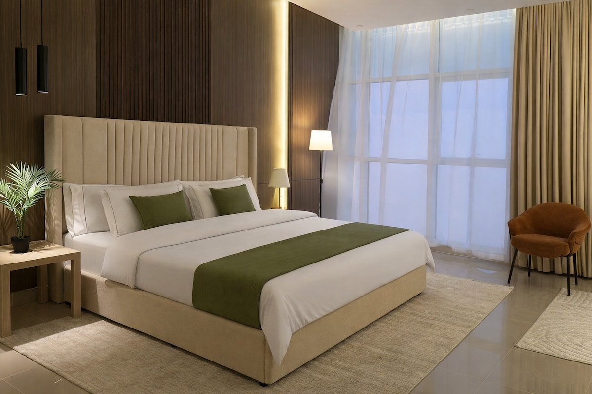 Augstākās klases dzīvoklis izcilā vietā Al-Fayziyah apkaimē Kasimā, tikai 20 minūšu attālumā no lidostas un 5 minūšu attālumā no Al-Nakheel Plaza un netālu no visiem pakalpojumiem, restorāniem un veikaliem. Dzīvoklī ir moderns dizains un elegants interjers, kā arī privāta guļamistaba, plaša atpūtas telpa ar ērtām mēbelēm un liela ekrāna televizors. Ir pieejams ātrs Wi-Fi, privāta autostāvvieta un grezna 5 zvaigžņu ieeja viesnīcā. Tajā ir arī neliela virtuve kafijas un uzkodu pagatavošanai ar ērtām sēdvietām. Ideāla izvēle īstermiņa vai ilgtermiņa rezervācijām, apvienojot komfortu, privātumu un ideālu atrašanās vietu. Reģistrācijai 50183042,6