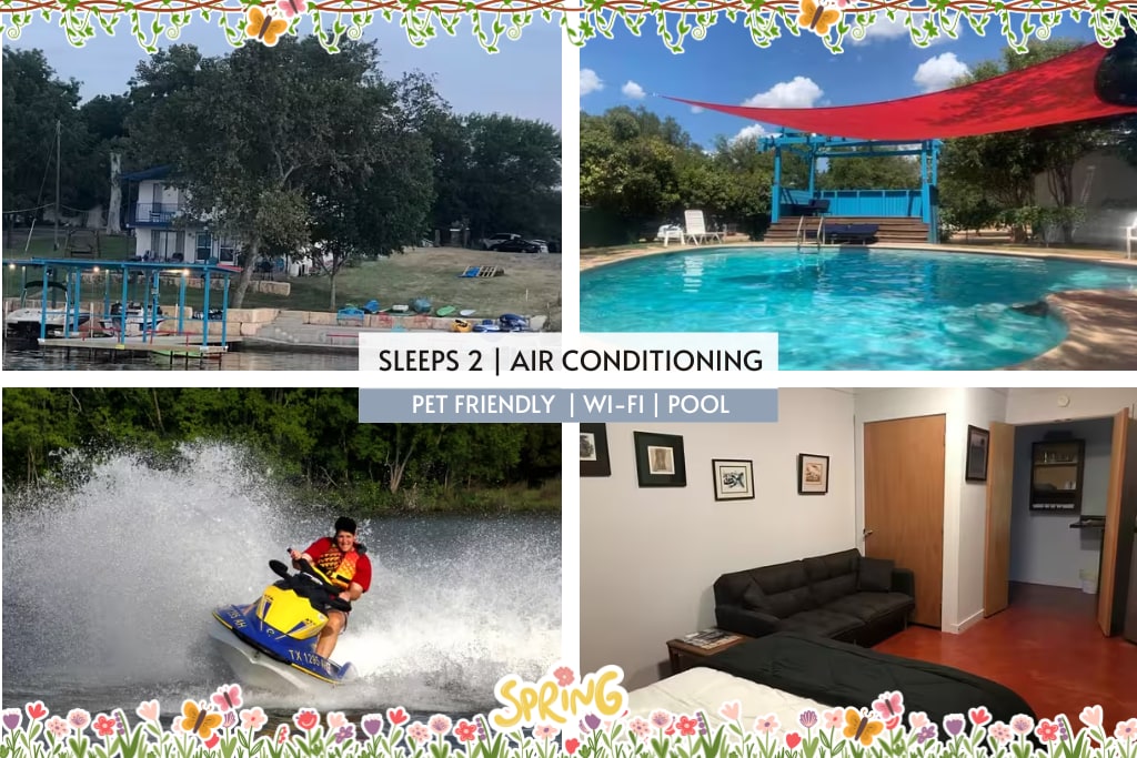 No flood risk! Back door to lake. This studio has a Queen and Full bed on lake Buchanan with direct sandy water access. Boat launch & Truck parking included. Large water active play structure, fish cleaning station, horse shoes. Back door to the lake/view, and every room has its own BBQ, chairs & picnic table under a covered concrete patio. Linens included. Samsung TV - Channels, stream & gaming hookup.