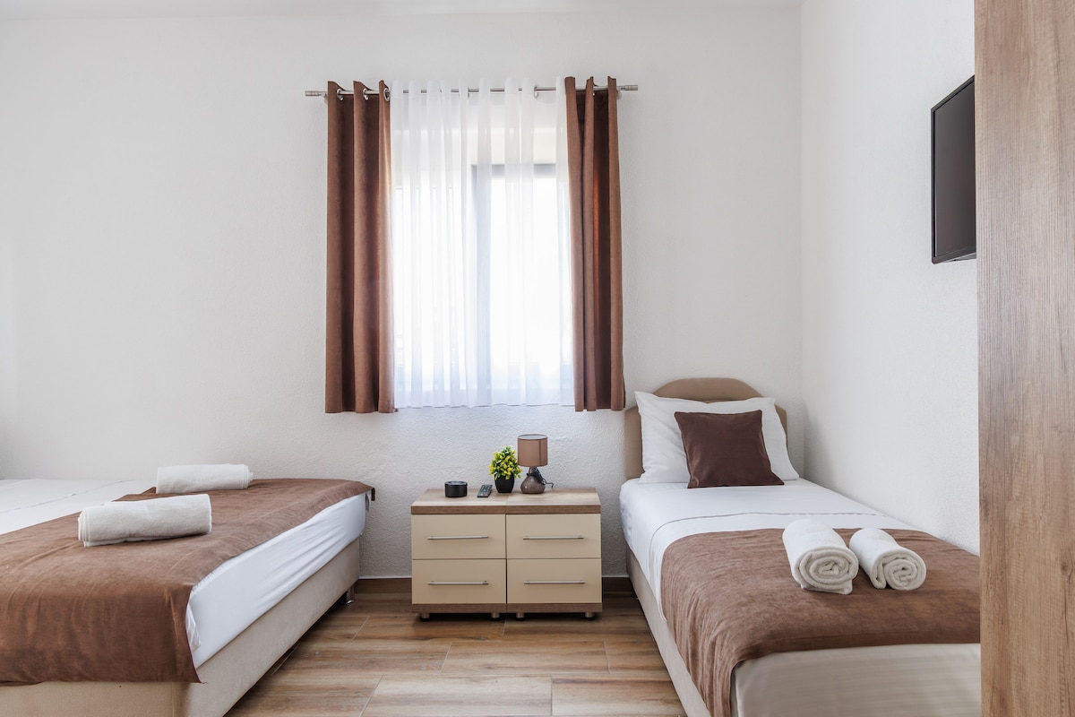 Apartman BFF je luksuzan, prostran i sunčan stan od 53 m², idealan za do 4 gosta. Pažljivo uređen za maksimalan komfor. Smješten u centru grada, sa restoranima, supermarketima i javnim prevozom na nekoliko koraka, dok je plaža udaljena 10 min. hoda. Nalazi se na 4. spratu zgrade sa liftom. Sastoji se od udobne spavaće sobe, elegantnog dnevnog boravka, potpuno opremljene kuhinje i modernog kupatila. Gostima su na raspolaganju brz Wi-Fi, kablovska TV, 2 klima-uređaja i parking ispred zgrade.
