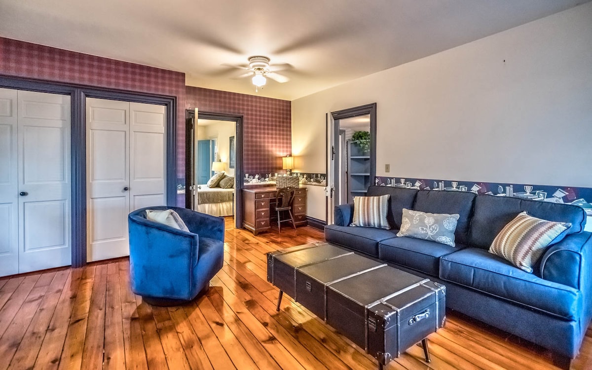 Grezns un plašs numurs ar ērtu karaļa gultu, WI-FI, pievienotu viesistabu ar divguļamo dīvānu un diviem roku krēsliem un privātu vannu ar vannu/dušu. 43 collu Roku viedtelevīzija guļamistabā un papildu televizors viesistabā. Šis numurs atrodas skaista vēsturiska mājokļa otrajā stāvā. Grandiozu kāpņu augšpusē jūs gaida privāta istaba ar atsevišķu ieeju. Tikai viens kvartāls no Mainstrītas, šis mājoklis atrodas pastaigas attālumā no restorāniem, alus darītavām, iepirkšanās vietām un muzejiem.