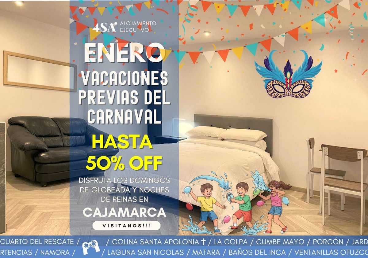 Atvienojieties no raizēm šajā plašajā un klusajā telpā, tajā ir pirmizrādes mēbeles, tā atrodas 10 minūšu attālumā no Cajamarca centra, tajā ir 120 m2, divas istabas ar ērtām gultām ar 2 gultām un roperu katrā, ēdamistaba, virtuve un veļas mazgātava, kā arī 02 higiēnas pakalpojumi ar karsto ūdeni 24 stundas diennaktī. Tas atrodas otrajā līmenī netālu no 03 parkiem, kluso un Seguras rajonu.