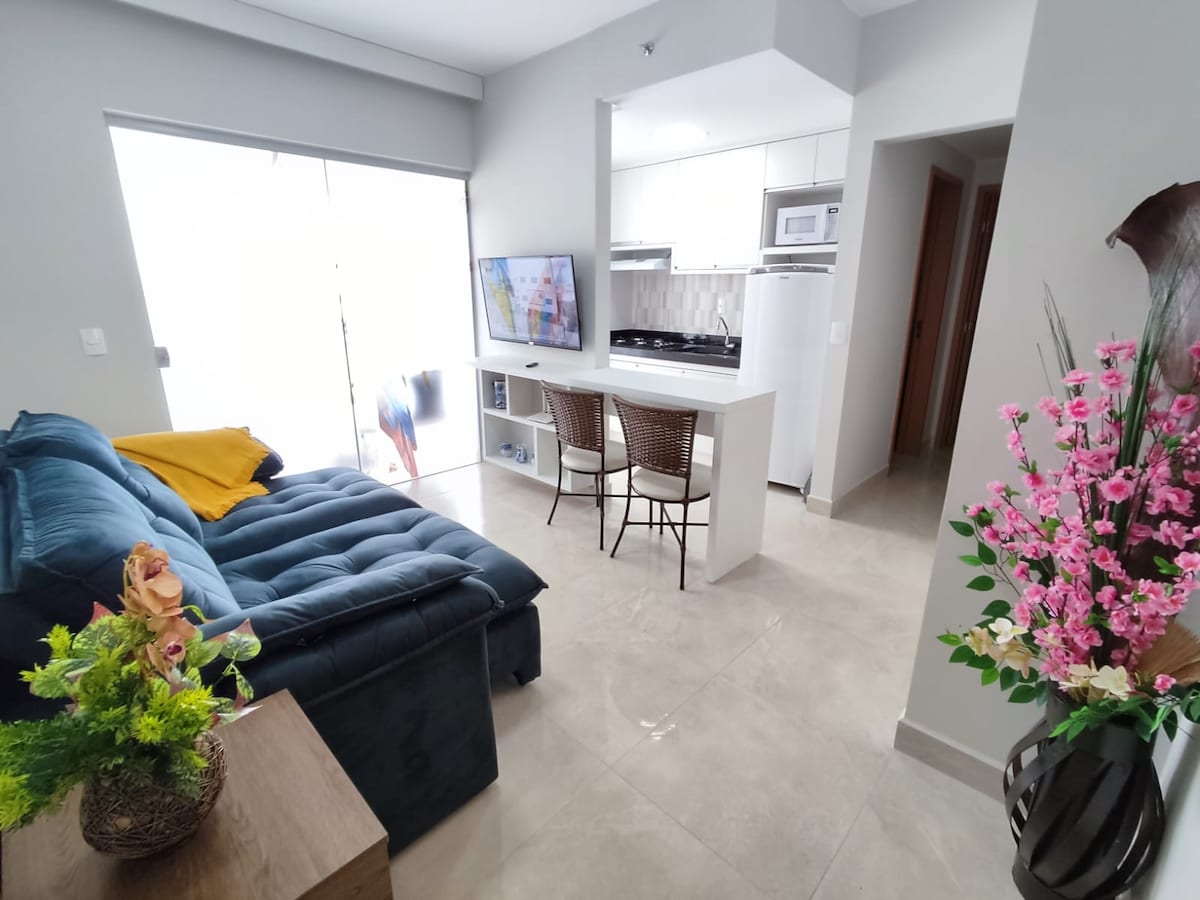 Apartamento aconchegante e preparado com muito amor é o cenário ideal para uma viagem inesquecível. Acesso livre todos os dias 24h/dia ao parque aquático Jardins com 16 mil m² de lazer, 12 piscinas, de ondas, ofurôs, bares, restaurante, brinquedoteca, salão de jogos, academia, toboágua, entretenimento diurno e noturno... Possui 2 camas de casal e 1 colchão extra, 2 TVs, ar condicionado, geladeira, fogão, micro-ondas, purificador, sanduicheira, panelas, talheres, copos, xícaras e muito mais!
