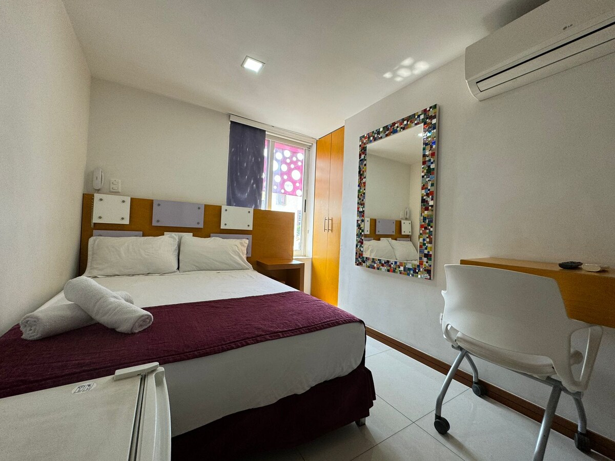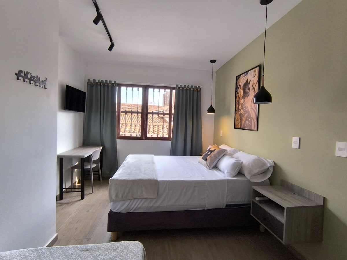 Disfruta una suite amplia con vista privilegiada al Convento La Merced, en pleno corazón histórico de Cali. Cuenta con 2 camas (1 doble y 1 sencilla), ideal para hasta 3 huéspedes. Baño privado, aire acondicionado, WiFi de alta velocidad y nevera para mayor comodidad. A solo pasos del Boulevard del Río y a 5 minutos caminando de la Calle del Sabor y varios museos. Ubicación estratégica, confort y cultura en un solo lugar.