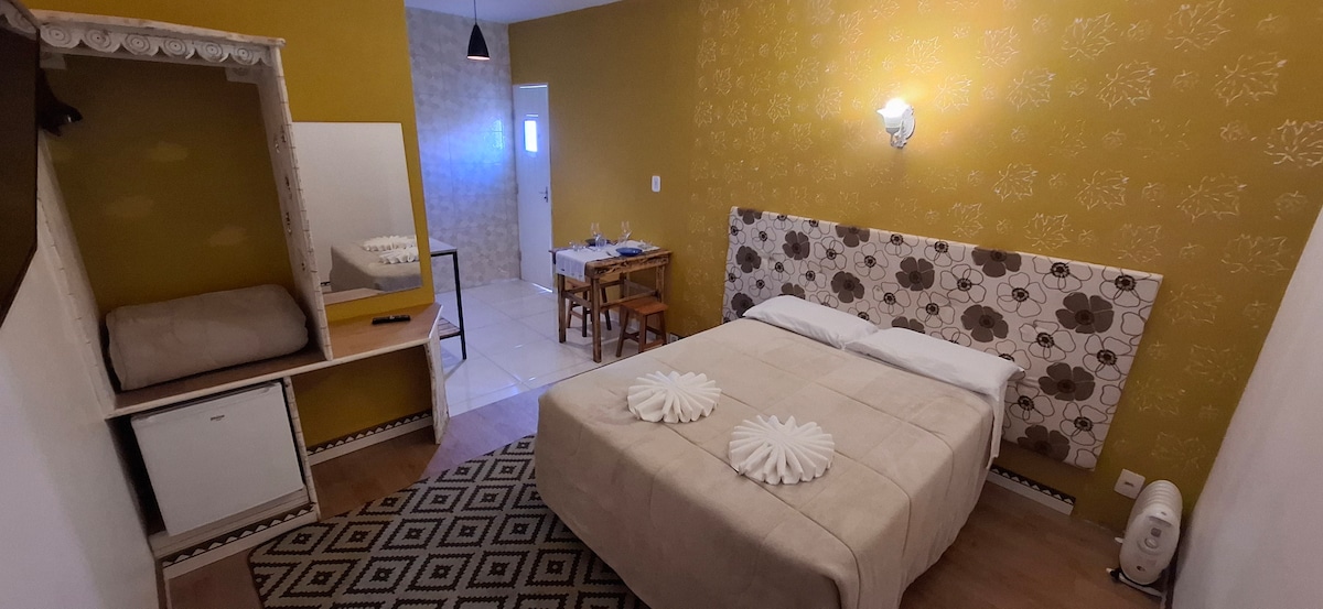 Dzīvoklis pāriem, kas meklē ērtu un mājīgu telpu. Atrodas Campos do Jordão tirdzniecības centrā, ideāli piemērots pārgājieniem un ērtai piekļuvei citiem tūrisma objektiem. Ērta divguļamā gulta, apsildāma duša un skats uz kalniem. Saimnieku ģimene visu sagatavo ar lielu rūpību, lai uzņemtu viesus. Apartamenti atrodas uz kopīgas zemes, un tiem var piekļūt pa elektroniskiem un individuāliem vārtiem ar atslēgu. Ģimene ir uzticīga un garantē privātumu.