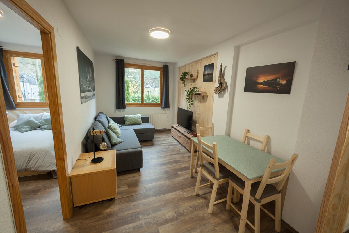 Ground-floor cozy apartment in Villanúa 🏔️ with a spacious garden-like terrace, perfect for sunny breakfasts or starlit dinners. Ideal for couples or families who love skiing ⛷️, hiking 🥾, and nature 🌲. Wi-Fi, Smart TV, full kitchen, air conditioning, and heating. Pets welcome. Easy parking at the door and just a few steps to access. Enjoy a charming retreat in the heart of the Spanish Pyrenees.