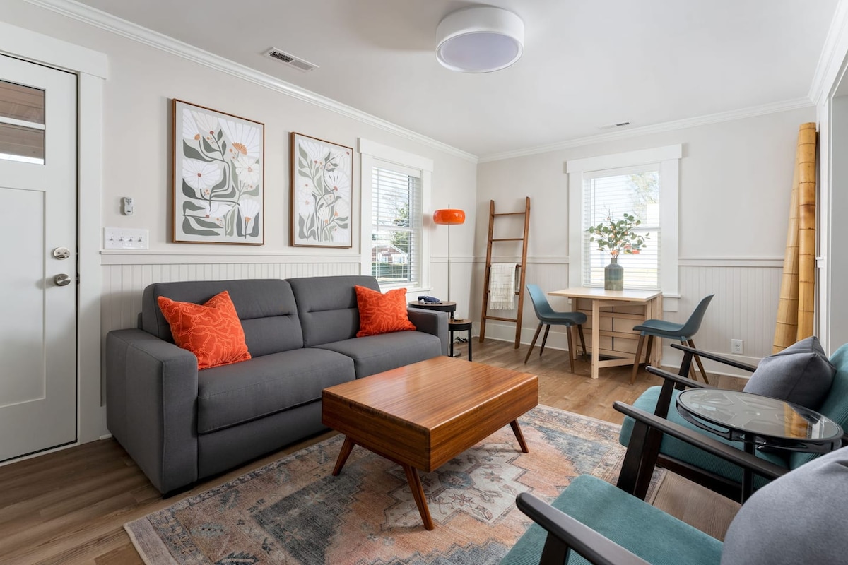 Laipni lūdzam Boho bungalo - 19. gadsimta Viktorijas laika 1 guļamistabas, 1 vannasistabas dzīvoklī, kas atrodas pašā Vilmingtonas centra vēsturiskā rajona centrā. Šajā mājoklī ir viss nepieciešamais, līdzsvarojot vēsturisko šarmu un modernas papildērtības - ideāli piemērotas atpūtai pārim vai nelielam ģimenes atvaļinājumam. Dodieties uz pilsētas centra restorāniem/bāriem, Cape Fear Riverwalk, lai noķertu saulrietu, vai dodieties nelielā braucienā līdz UNCW (10 min) vai pludmalei (20 min). Šī centrā esošā atpūtas vieta sniedz jums visu, ko piedāvā Vilmingtona.