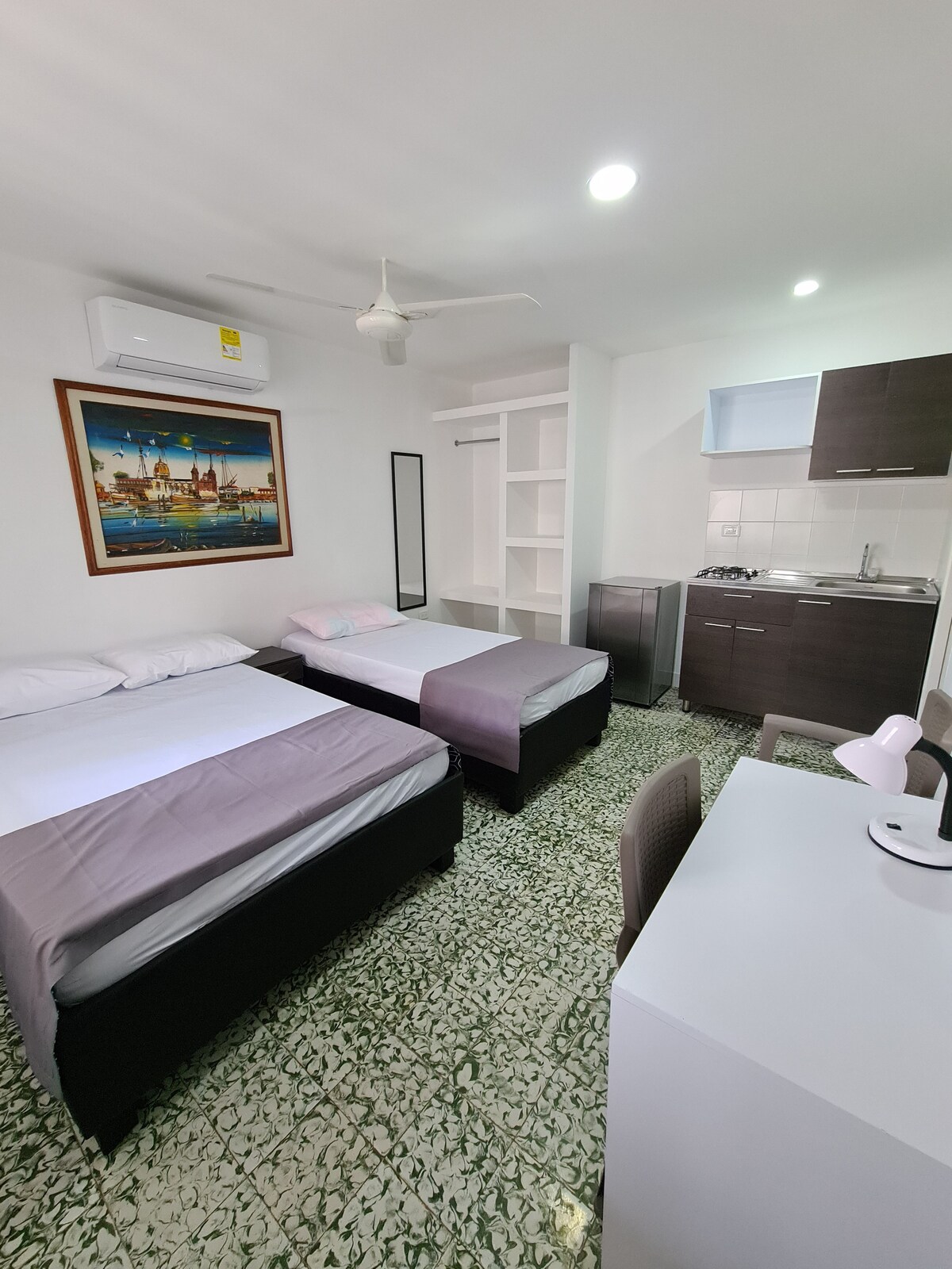 APARTAESTUDIO AR MINIVIRTUVI, iekšējo vannasistabu, ledusskapi, rakstāmgaldu, viedtelevīziju, viedtelevīziju, gaisa kondicionētāju, ventilatoru, Wi-Fi un visiem pakalpojumiem. Iespaidīga atrašanās vieta vēsturiskajā centrā, ko ieskauj restorāni, tirdzniecības un tūrisma objekti. 3 kvartālu attālumā no tirdzniecības centra La Serrezuela un 5 minūšu attālumā no Bokagrandes pludmalēm