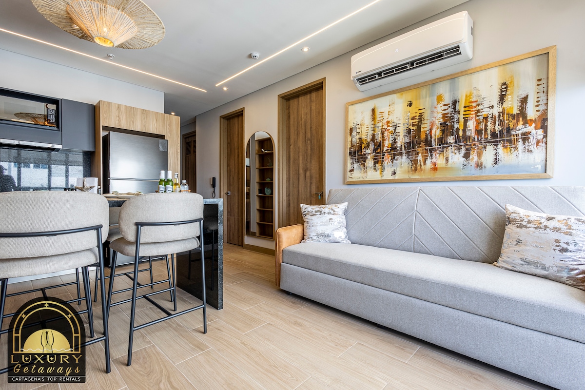 Loft colonial en el corazón del Centro Amurallado de Cartagena, Disfruta de techos altos, un gran ventanal y una atmósfera elegante llena de luz natural y encanto. El Loft dentro del Centro Histórico de Cartagena, a pasos de la Torre del Reloj, ofrece fácil acceso a todo lo que hace que este lugar sea tan especial desde los animados mercados locales y los modernos café, restaurantes, bares, encontrarás algo nuevo y emocionante para explorar en cada esquina.