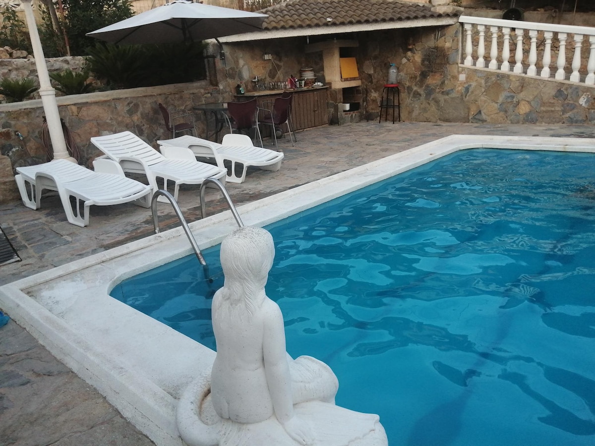Brīnišķīga māja urbanizācijā. Tas sastāv no grīdas ar četrām guļamistabām un vannasistabas ar divām divguļamajām gultām un četrām vienguļamajām gultām, ar iespēju atvērt zemāk esošo grīdu, kas piestiprināta garāžai, kas sastāv no divvietīgas gultas istabas, un viesistabas ar divām divguļamajām dīvāngultām un citas vannasistabas ar burbuļvannas kolonnu. Mājai ir liels baseins, grils ar nojumi, galda tenisa galds, Daiena, batuts dārzā, trīsvietīgas šūpoles...