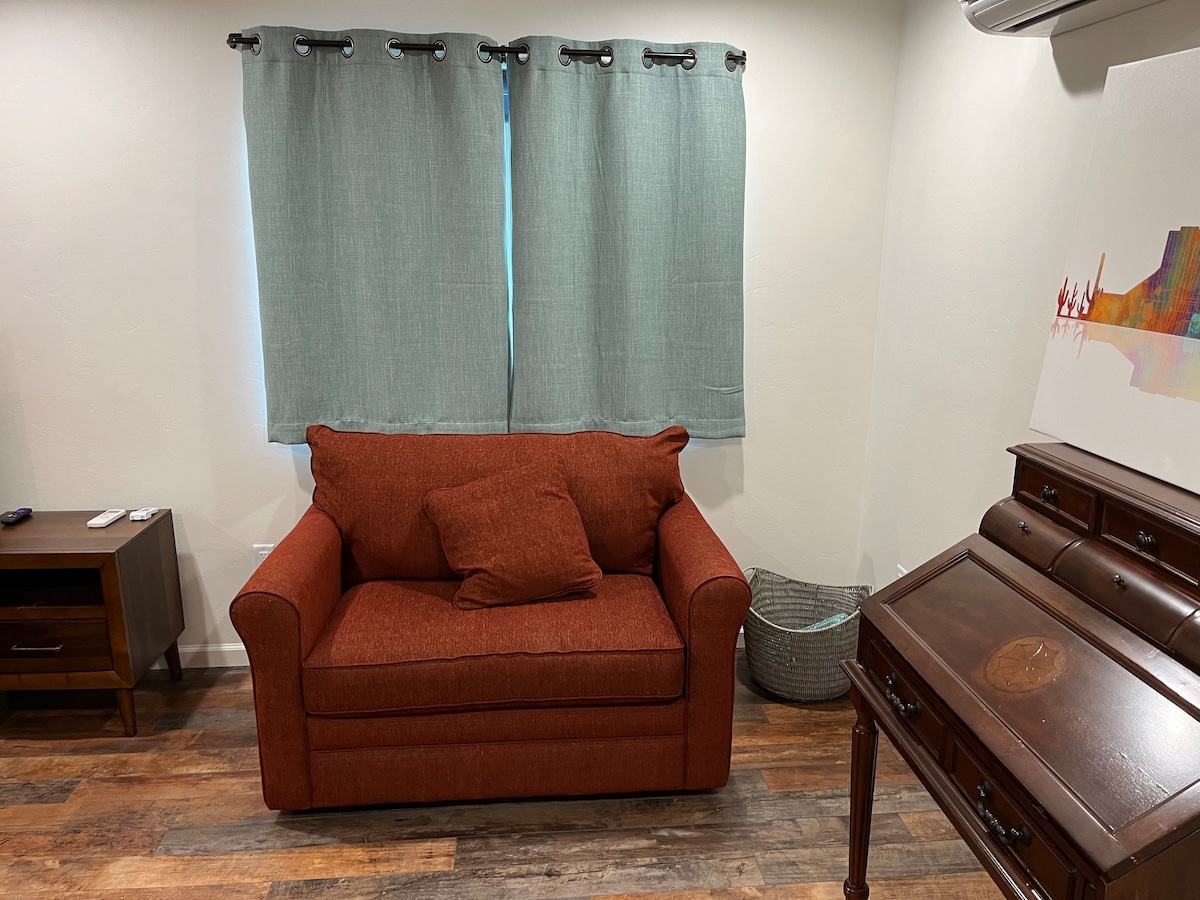 Family friendly (with ungated pool) 411sq ft studio-style space with 2 open sleeping areas. Sleeps up to 4. King feather bed & a pullout queen sleeper. Located past a quaint garden where you can catch hummingbirds. Private parking & entrance just come & go. BOOK Our Other King Suite right next to the Casita! Can sleep 2 additional guests! Cool off in pool, use outside patio (where cooking station is located, there's no kitchen in the casita). Min. from I-10 & stellar Tucson Biking Loop!!
