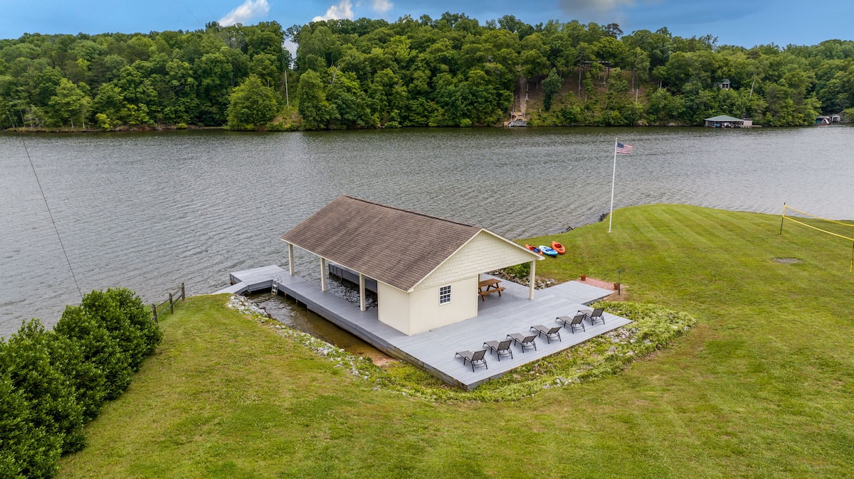 Get away from the stresses of life with this 3-Bedroom lakehouse with large boathouse. Sleeps 10 people in bedrooms and additional spaces on living room on couches. Breathtaking view of the lake and surrounding. Enjoy the water with included floating water mat or explore the area with our 2 kayaks and 2 paddle boards. Home features 3 bedrooms, 2 full baths, spacious full kitchen, washer/dryer, fire pit, 1,000MBs WIFI, YouTube LiveTV, gas grill , whole house standby generator and other amenities.