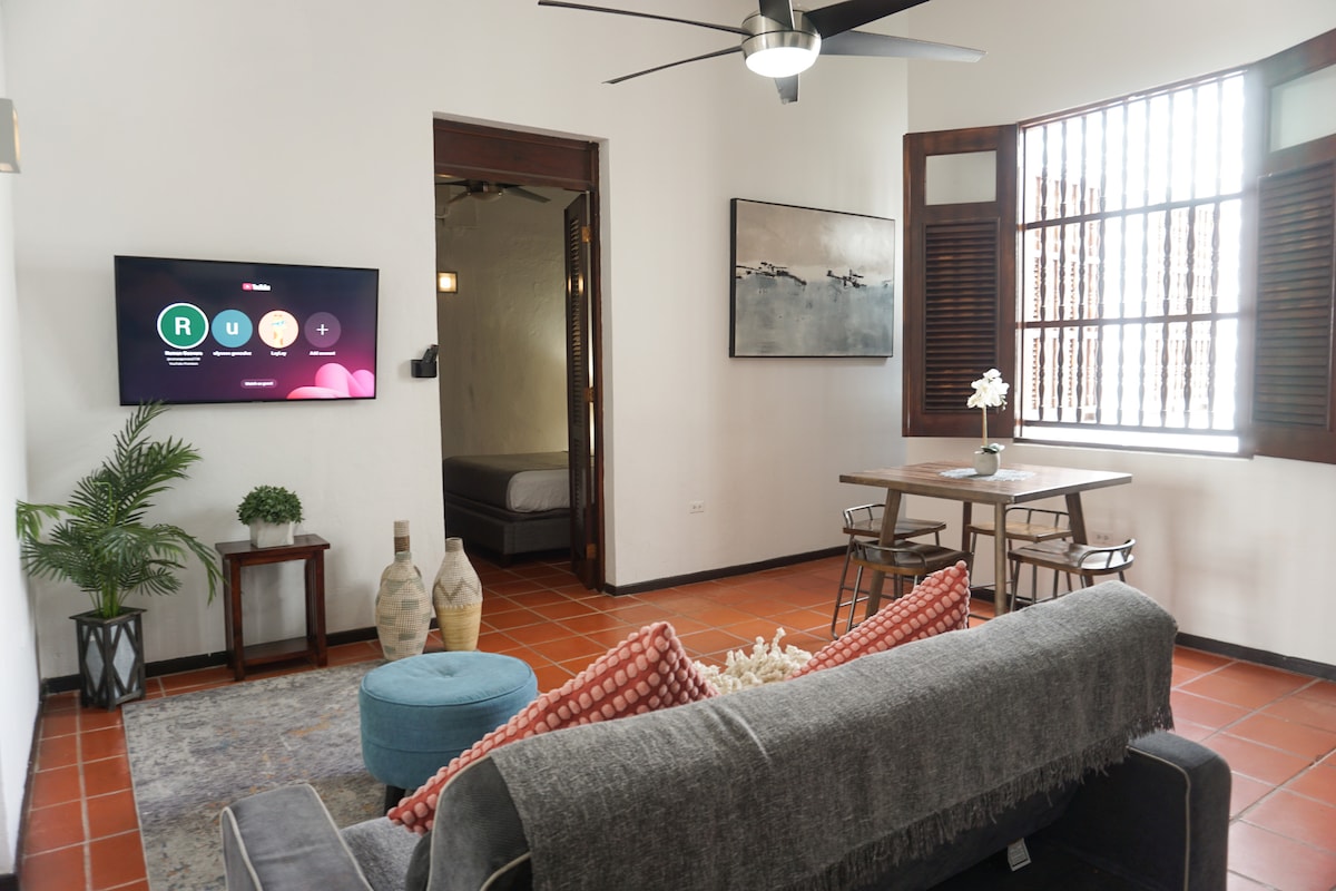 Izbaudiet veco Sanhuanu no šīs skaisti restaurētās koloniālā stila ēkas. Mūsu mājīgais 2 guļamistabu dzīvoklis piedāvā šarmu, komfortu un nepārspējamu atrašanās vietu - ideāli piemērots atpūtai, romantiskai atpūtai, darījumu braucienam vai ātrai atpūtai. Izbaudiet plašu viesistabu, pilnībā aprīkotu virtuvi, ērtu vannasistabu un mierīgu iekšēju terasi, kur atpūsties un relaksēties. Rezervējiet mājokli jau šodien un padariet savu apmeklējumu patiesi neaizmirstamu!