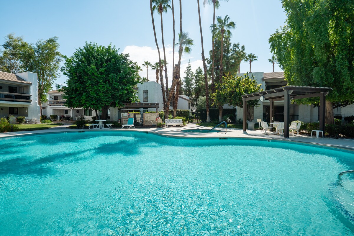 Mēs atrodamies tuksneša kūrortpilsētā Palmspringsā, tuksneša oāzē, kas atrodas San Jacinto kalnu pakājē, netālu no Palmspringsas lidostas un pastaigas attālumā no pilsētas centra un konferenču centra. Īpašumā nav lifta. Apakšstāva mājokļi ir pieejami atkarībā no pieejamības, un to pieejamība netiek garantēta. Kūrorta pakalpojumu nodeva 29,00 $ par nakti ir iekļauta Airbnb norādītajā kopējā cenā. Šī nodeva sedz autostāvvietu, Wi-Fi un piekļuvi klātienes papildērtībām.
