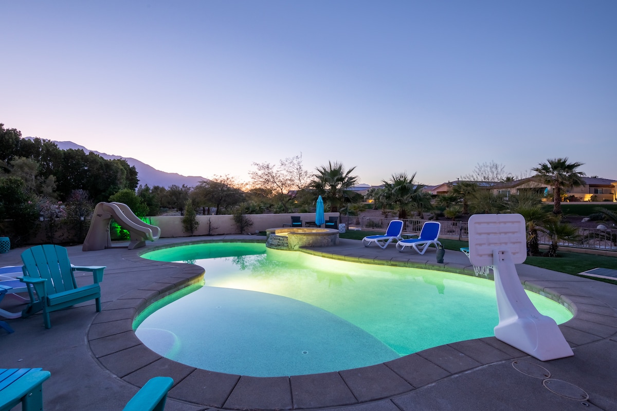 Katedrāles pilsētas pilsētas STVR atļaujas Nr. BLIC-000158-2021 Moderna 4 guļamistabu 3,5 vannasistabu villa, kas atrodas privātā golfa kūrorta kopienā ar vārtiem. Šis ir īpašums uz stūra kopienas malā, daudz privātuma un pilnībā nožogots. 10 minūšu attālumā no Palmspringsas centra. Garāžas spēļu istaba ar gaisa kondicionētāju un gaisa hokeju un futbola bumbu. Privāts liels baseins (tiek tīrīts divas reizes nedēļā) un burbuļvanna. Ūdens slidkalniņš bērniem. Pieejama privāta golfa ratiņu noma. Piemērots mīļdzīvniekiem. Priecāsimies jūs uzņemt:)
