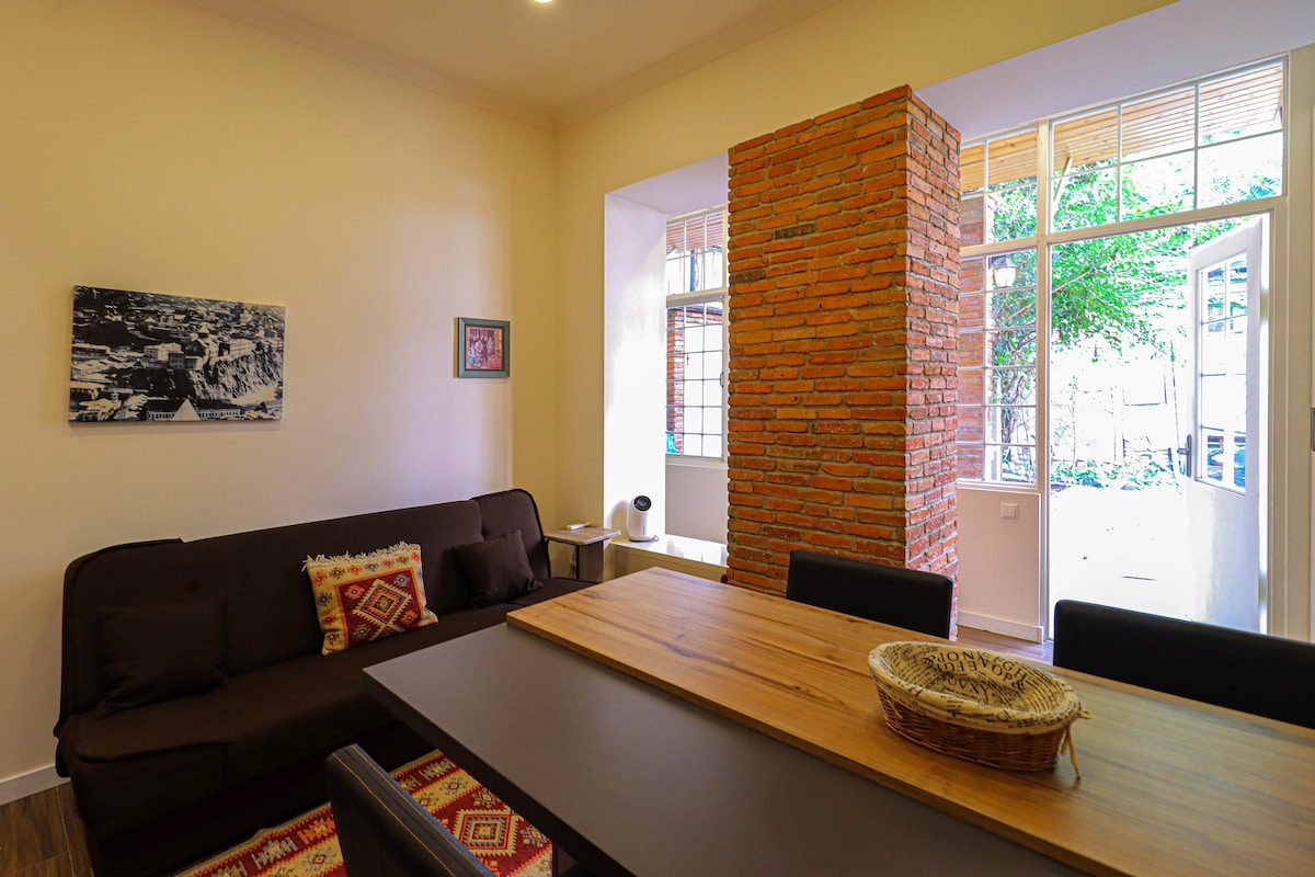 Mūsu dzīvoklis atrodas pašā Tbilisi vēsturiskās daļas centrā. Mēs atrodamies slavenās gruzīnu gleznotājas Elenes Akhvlediani muzeja pirmajā stāvā. Mājas interjers ir autentisks gruzīnu stilā, sekojot mūsu senča soļiem, kurš bija arī gleznotājs.Ārpus pergolas jūs varēsiet atvēsināt degustāciju mūsu ģimenei izgatavoto vīnu no mūsu eko tīriem vīna dārziem. Laipni lūdzam Tbilisi dārgais tūrists, ar mūsu rokām plaši atvērts - vēlu mūsu mājā un būt mūsu viesis!