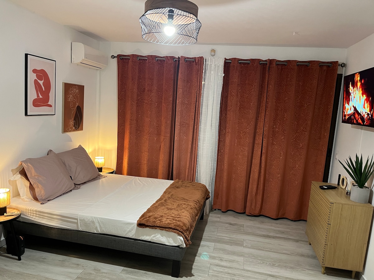 Studija ar gaisa kondicionētāju 25 m² platībā ar neatkarīgu virtuvi, 3,5 km attālumā no Place des Palmistes un 500 m attālumā no Montabo pludmales. Tuvumā atradīsiet dažus veikalus un restorānus. Studija atrodas blakus mūsu mājai, un tajā ir autostāvvieta. Jūs varat atpūsties āra terasē ar skatu uz lielu sāls baseinu. Iespēja pievienot lietussarga gultu mazulim. Mēs nepieņemam ballītes.