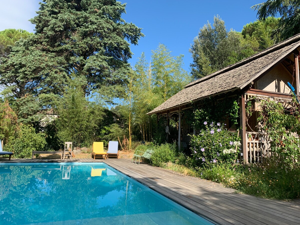 Neliela, vienkārša māja 30 m2 platībā, labi aprīkota, mežaina kalna malā, klusa, meža ielokā. Ideāli piemērots brīvdienām: pāris ar 2 vai 3 bērniem. Namiņš, 4 m batuts, smilšu kaste, šūpoles, šūpuļtīkli uz viegli slīpas, terasētas, diezgan mežonīgas. Peldēšana 1 km attālumā, jāšanas centrs 500 m attālumā. Tuvu alām, Bambouseraie, muzejiem. Starp izbraucieniem bērni turpina baudīt dabu, spēlēties ārā, kamēr vecāki gatavo ēdienu vai atpūšas.