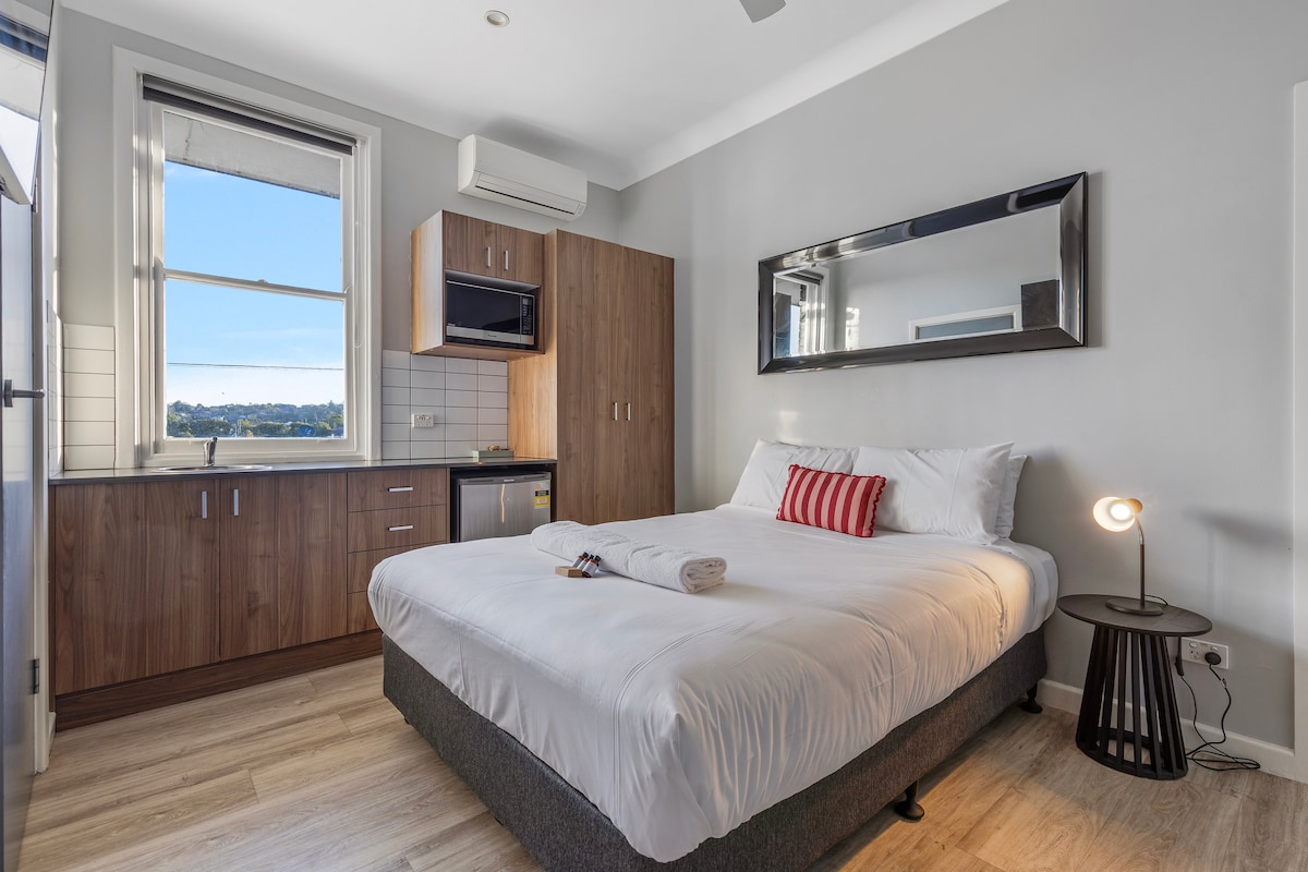 A modern queen studio designed for a comfortable and fuss-free stay. Featuring a plush queen bed and a private ensuite bathroom, this room is perfect for travelers who value convenience and privacy. After a long day, head downstairs to enjoy a meal, a drink, or simply soak in the relaxed pub atmosphere before retreating to your own quiet space upstairs.