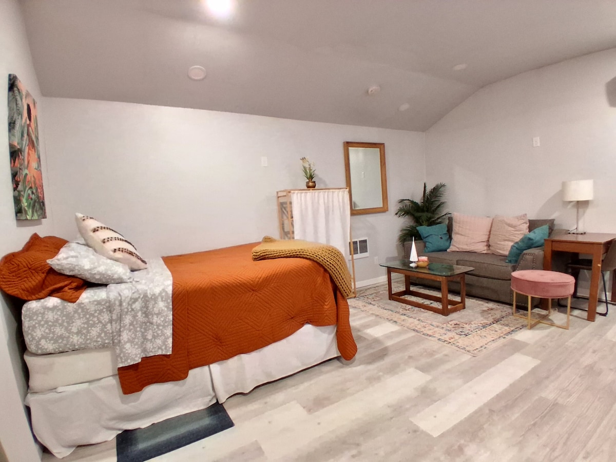 Moderns, bet mājīgs, 562 kvadrātpēdu lofta dzīvoklis ar pilnu virtuvi un vannu, divguļamo gultu (ar Winkbeds Luxury Firm matraci), divvietīga Mērfija gulta / rakstāmgalds, viesistaba, skapis, FireStick, Roku, DVD atskaņotājs, Wi-Fi un daudz kas cits. Ņemiet vērā, ka klēts atrodas mūsu pagalmā un ir daļa no mūsu mājām, tāpēc mēs neatļaujam tūlītējo rezervēšanu. Mēs zinām, ka tas sagādā nelielas grūtības, taču ceram, ka visi sapratīs, ka arī mēs šeit dzīvojam.