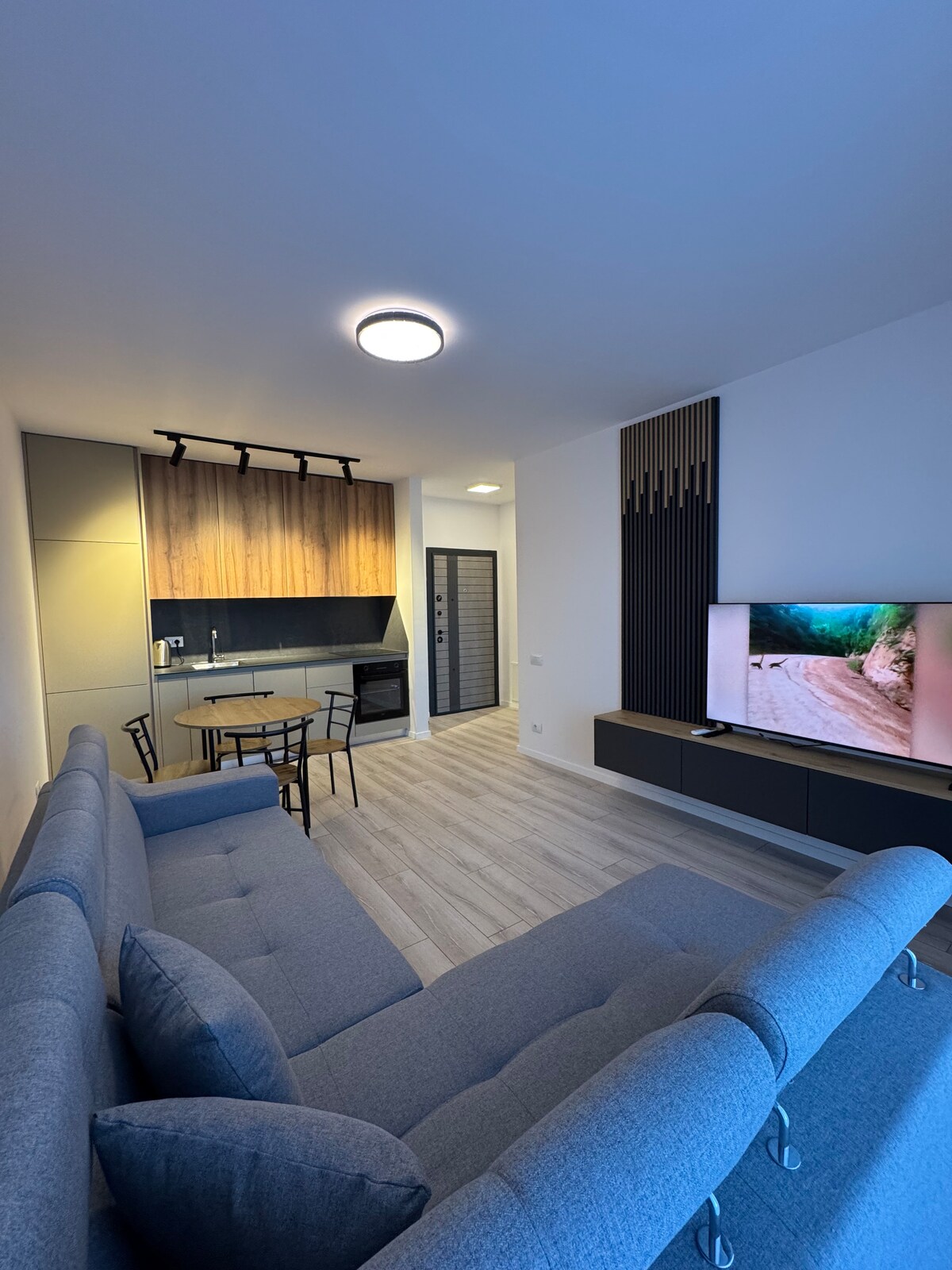 Šis mūsdienīgais dzīvoklis piedāvā ērtas telpas vienatnē ceļojošiem ceļotājiem, pāriem vai nelielai ģimenei, kas vēlas izbaudīt pilsētu kā vietējie. Pateicoties ērtajai atrašanās vietai, stilīgajam dizainam un pārdomātajām papildērtībām, jūsu ceļojums šeit būs patiesi neaizmirstams. Atvērtā koncepta izkārtojums nevainojami savieno viesistabas, ēdamistabas un virtuves zonas, radot plašuma sajūtu. Dzīvojamajā istabā ir dīvāns, kas ir ideāli piemērots atpūtai pēc iepazīšanas dienas, un plakanā ekrāna televizors jūsu izklaidei.