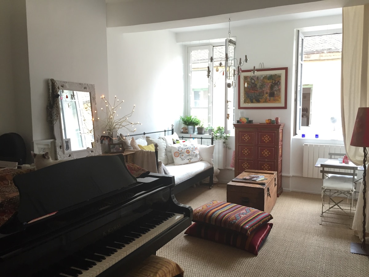 Īres mājoklī, kas atrodas pašā Chalon-sur-Saône sirdī, starp Sentvinsentas katedrāli un Sonas piestātnēm, ir viss nepieciešamais, lai pavadītu dažas naktis mūsu skaistajā pilsētā Burgundijā. Ar neatkarīgo ieeju jūs varat baudīt uzturēšanos patstāvīgi. Privāta vannasistaba un tualete, ledusskapis, mikroviļņu krāsns, tējkanna, kafijas automāts, televizors veido šo studiju. Lūdzu, ņemiet vērā, ka jums nav karstā punkta (stikla vai indukcijas plīts vai izlietnes).