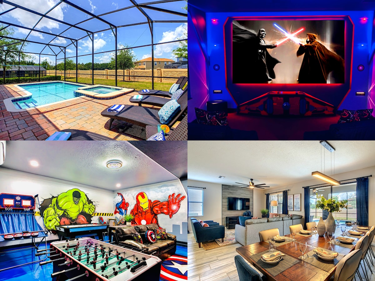 Ierobežota laika piedāvājums – izbaudiet BEZMAKSAS baseina apsildi (30 ASV dolāru vērtībā par nakti), veicot rezervāciju līdz 1. decembrim ✦ Tikai dažu minūšu attālumā no Disneja pasaules 🏰 ✦ 8 guļamistabas, 16 guļvietas 🛌 ✦ Uz dienvidiem vērsts baseins un džakuzi! ☀️ ✦ Spēles: 1000+ klasiskas arkādes spēles, iekštelpu basketbols, gaisa hokejs, PS5 un Xbox Series X 75" 4K televizoros 🎮 ✦ Viedie 4K televizori visā mājoklī ✦ 100+ collu mājas kinozāles ekrāns 🎬 ✦ Ar roku apgleznotas saldētas un atriebēju tematikas guļamistabas ✦ Īpaši ĀTRS WI-FI ✦ Čempionu vārtu kluba piekļuve ar ūdens atrakciju parku 🏖