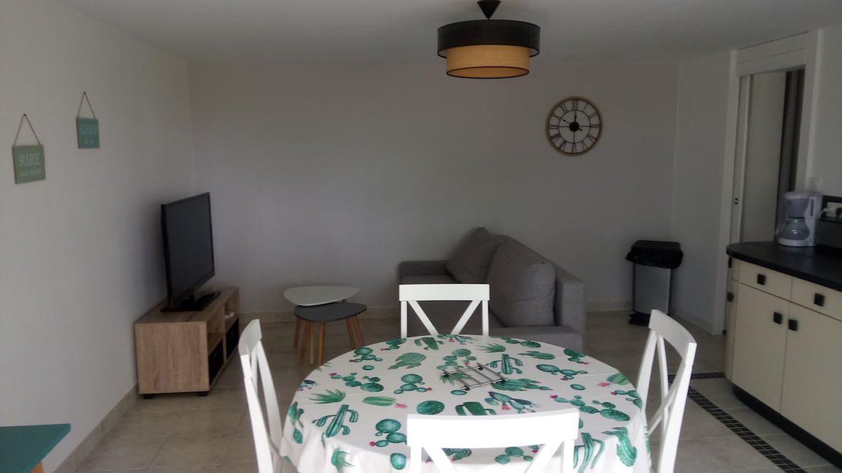 Studija atjaunota 2020. gadā 4 m attālumā no Puy du fou ar automašīnu un 2 m ar kājām no veikaliem (maiznīca, pārtikas veikals, restorāns, tabaka,...) Jums ir viesistabas, divguļamā gulta un ēdamistabas/virtuves telpa. Dzīvoklis atrodas pirmajā stāvā. Viesi var novietot automašīnu drošā segtā autostāvvietā. Es varu nodrošināt jums palagus, dvieļus, tējas dvieļus, tējas dvieļus par 18 € ar gultu, kas izgatavota pēc ierašanās:) Lai vienkāršotu izrakstīšanos, ir iekļauta uzkopšana.