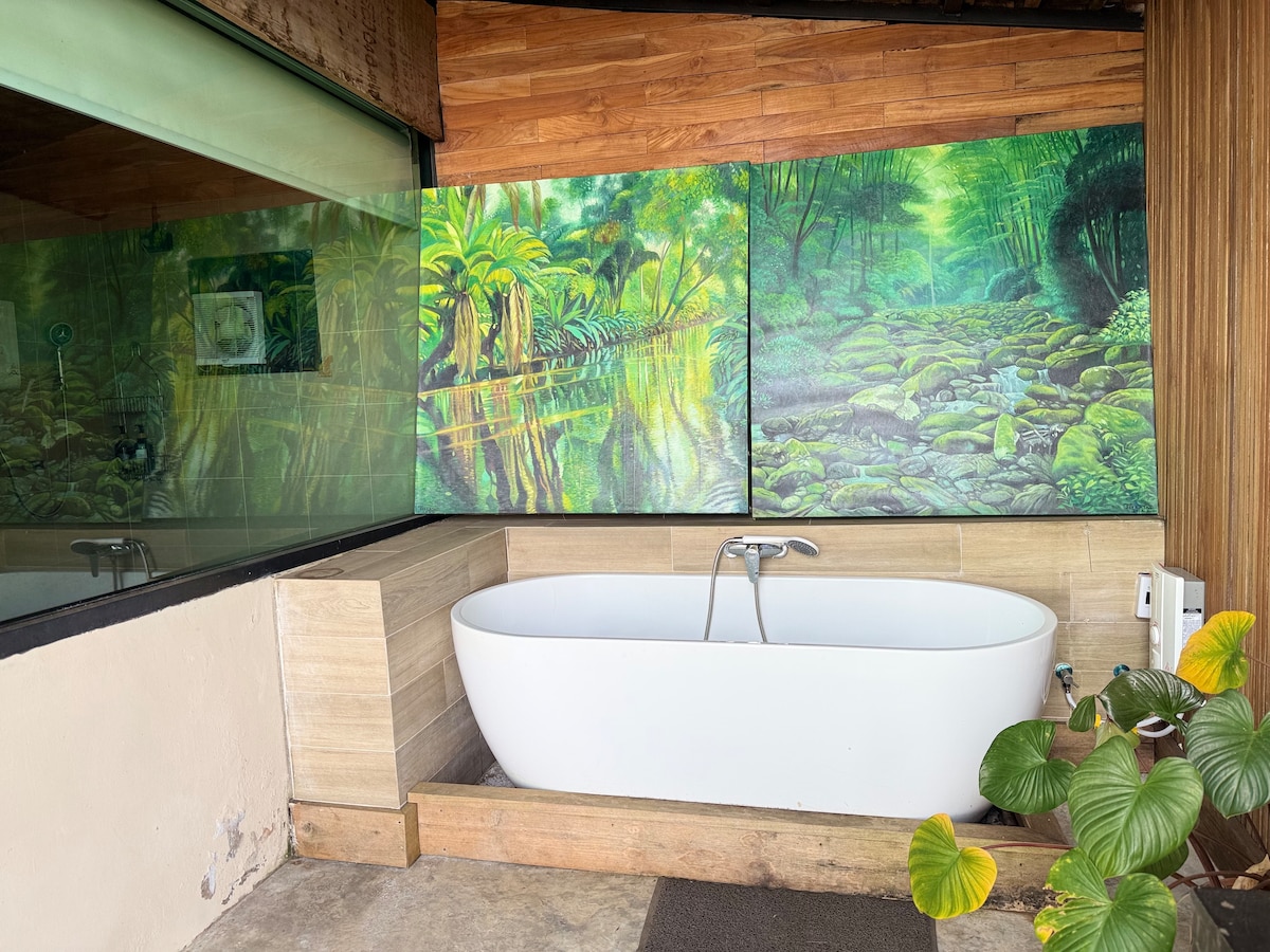 Izbaudiet dabas skaņas, dzīvnieku kompāniju, saullēkta un saulrieta mainīgās krāsas. Šī istaba ir divu stāvu namiņš, kas būvēts no veca tīkkoka koka un dabiska bambusa materiāla. Tajā ir privāts dārzs, daļēji āra duša ar koka mucas vannu, privāta tualete un dzīvojamā istaba. No tās paveras vislabākais skats uz mūsu saimniecību. Ar balkonu, kas vērsts uz iespaidīgo skatu uz kalniem, un paveras skats uz visu saimniecību no visiem leņķiem. Tas ir labākais risinājums pāriem un ģimenēm.