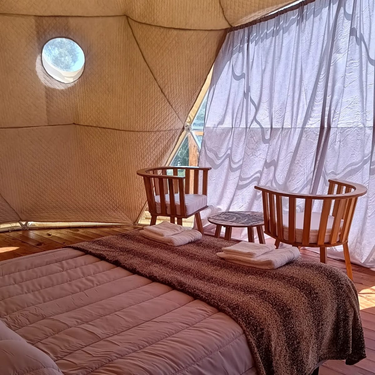 Domo Geodésico de madera, diseñado para parejas. Este domo ofrece la posibilidad de armarlo con dos camas individuales de una plaza. Estamos en una pequeña chacra, granja en la hermosa cordillera patagónica, con una vista de 360 grados de los bosques y montañas. Descanso garantizado para disfrutarlo en pareja.