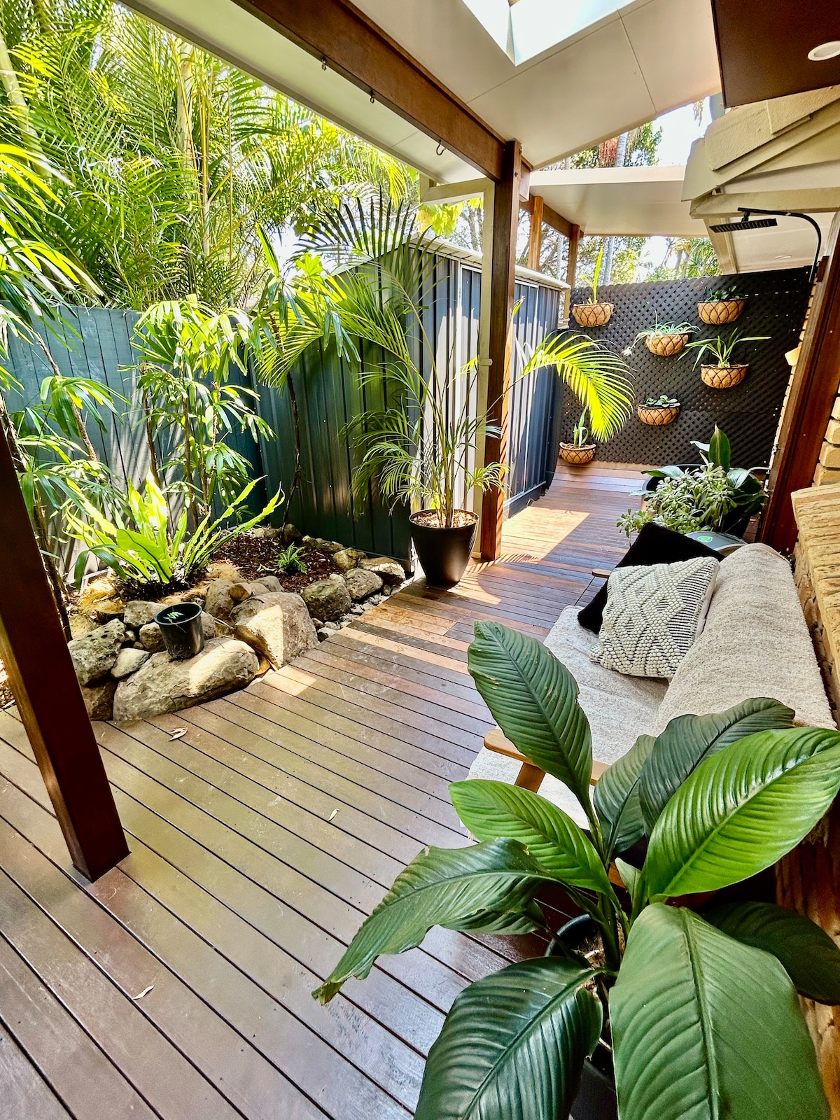 An oasis within metres of Byron Bay-cafes, beach and shops. Our guests have described it as the perfect location. Beautifully designed with blissfully comfy beds and lounge. All newly renovated and air con in all rooms. Everything you need for a comfortable stay, including a hot outdoor jacuzzi (9 am-10 pm) a bathroom with each bedroom and filtered water from every tap. We have a strict noise curfew at 10 pm. Strictly NO PARTIES, no Schoolies, as we are in a quiet zone, please do not ask