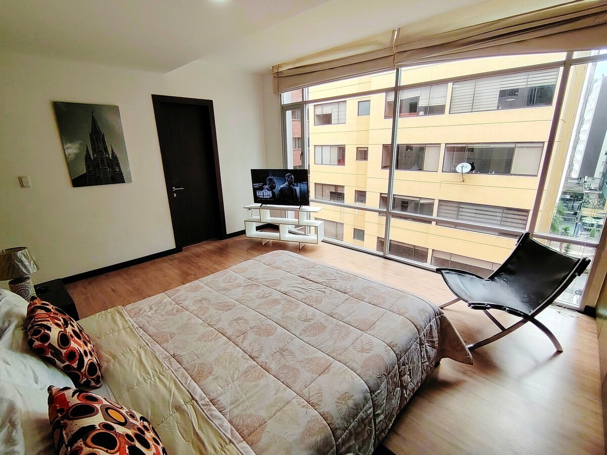 Apartamenti atrodas Mariscal rajonā, Monarch ēkas piektajā stāvā, kurā ir apsardze. Atrašanās vietas dēļ no tā paveras skaists skats uz kalniem (skatīt bildes). Apartamenti ir privāti, tajā ir Wi-Fi, televizors LG, divguļamā gulta, divas dīvāngultas, privāta vannasistaba ar karstu ūdeni, balkons un pilnībā aprīkota virtuve. Apartamentu atslēgas tiks piegādātas ar atzīmi galvenajai ieejai. Papildu mājoklī ir iekšēja autostāvvieta. Laipni lūdzam Kito un izbaudiet uzturēšanos galvaspilsētas labākajā rajonā.