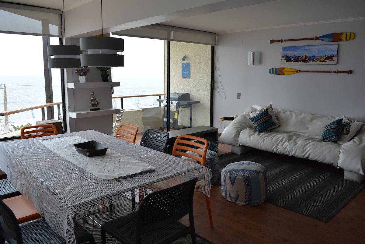 Lindo departamento con preciosa decoración. Totalmente equipado para 4 personas . Primerísima línea, vista libre, espectacular e inmejorable a Valparaíso, se encuentra a 15 min caminando de la playa Cochoa (hay que bajar una escalera). Está a pasos de Supermercado Lider y Jumbo. Incluye 1 Estacionamiento privado subterráneo. Excelente conectividad y transporte público a una cuadra. DEPTO SOLO PUBLICADO EN AIRBNB No redes sociales ni otras plataformas.