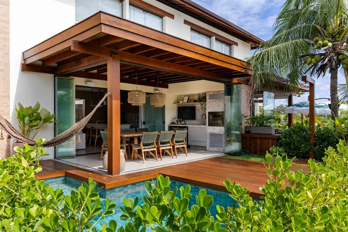 Burvīgs divstāvīgs bungalo ar 3 guļamistabām ar gaisa kondicionieri, izsmalcinātu verandu ar grilu un skatu uz dārzu ar galdu, saulessargu un dušu. Atrodas Imbassaí Privilege, piedāvā modernu, ērtu telpu ar pilnībā aprīkotu virtuvi, lielisku āra zonu, baseinus, laukumus, rotaļu laukumu un privātu piekļuvi pludmalei un upei. Ideāli piemērots ģimenēm, pāriem un draugiem, kas meklē komfortu pie jūras.