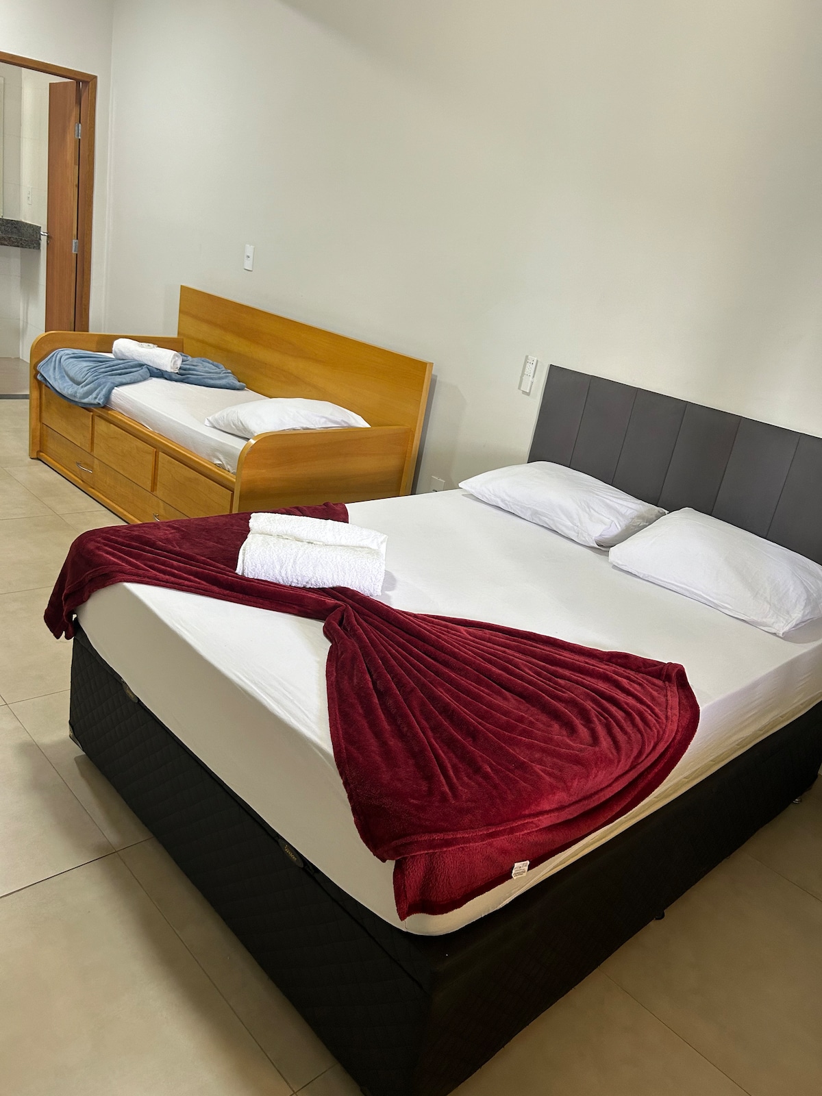 O espaço Acomoda até 5 hóspedes com conforto. 2 quartos: Quarto 1: cama de casal e ventilador Quarto 2: 2 cama de casal + guarda roupa + ventilador A Sala é convidativa e tem TV Smart para relaxar após um dia de trabalho ou passeio. A cozinha é equipada com o básico para as suas refeições. Cozinha equipada com todos os útensílios necessarios para a hóspedagem. 1 banheiro. 1 vaga de garagem. {OBS: apenas para carros pequeno\medio}. Próximo a varios comercios , lugar perfeito para descansar.