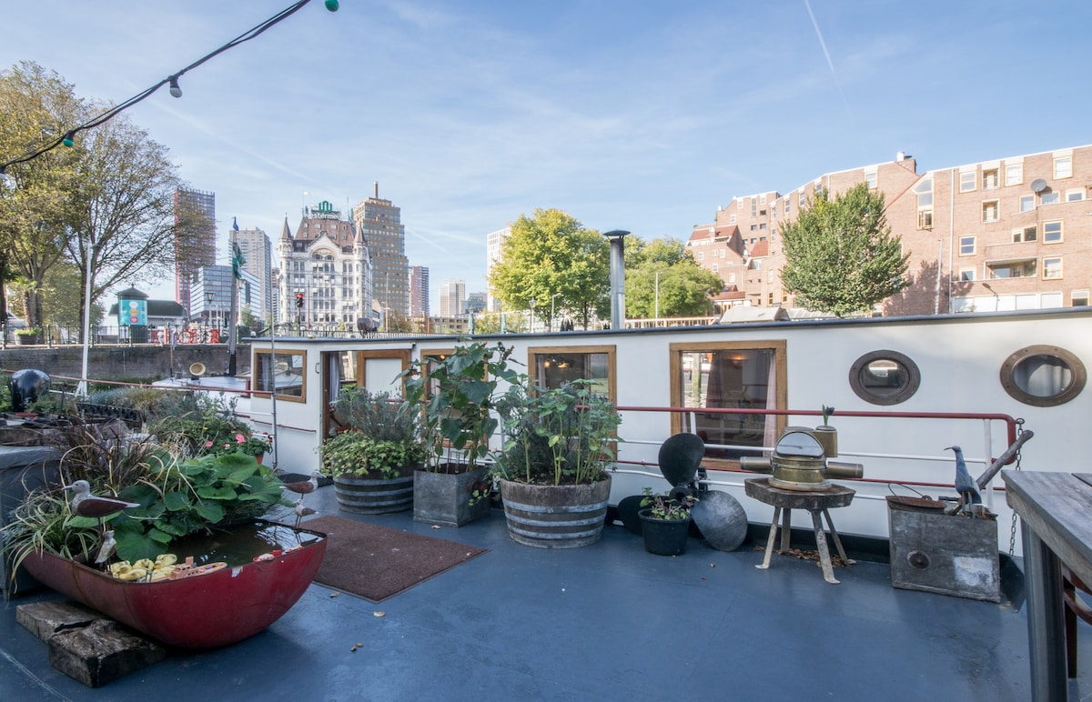 Romantic overnight in the deckhouse of a historic ship. This skipper's house is 4x5 m2 and 182 cm high. With a seat on the roof of the deckhouse and a beautiful view. This special and bright space is located in a quiet spot in the heart of Rotterdam in the former skipper's house of the historic ship "Veinard", which means "Bofkont". Spending the night here will complete your Rotterdam experience, whether you came for relaxation and fun or as a business traveler. welcome!